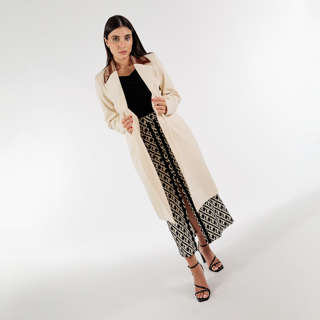 La colección de abrigos de este otoño-invierno 2024/25 se caracteriza por su afán de protagonismo y sofisticación, y este modelo no es la excepción. Con su dibujo de espigas en contraste con el terciopelo, es mucho más que un simple abrigo de paño utilitario, es una prenda que añade un toque especial a cualquier look.