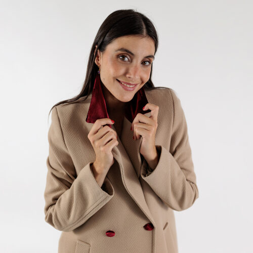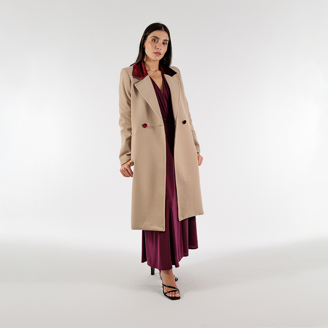 El Abrigo Letizia  de paño que te traemos en Darwin Collection es una pieza imprescindible para esta temporada. Diseñado en un elegante color tostado con un cuello solapa de terciopelo burdeos, este abrigo es pura sofisticación. Su diseño versátil lo convierte en una prenda ideal tanto para un look casual del día a día como para eventos más formales, ¡incluso es perfecto como abrigo de invitada para bodas de invierno!