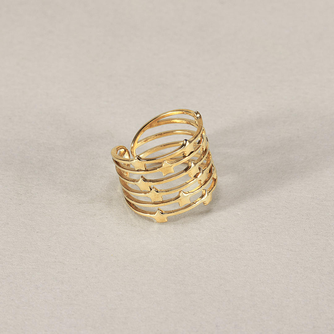 El Anillo Cielo es un anillo Darwin que destaca por su sencillez y elegancia. Este anillo lleva seis barras en color dorado que lucen en el mismo todo lleno de pequeñas estrellas. Es un anillo muy básico pero de lo más actual, con líneas muy sencillas y planas que marcan un estilo arquitectónico. Es tendencia en este año el combinar piezas grandes y llamativas con otras más sencillas y básicas.