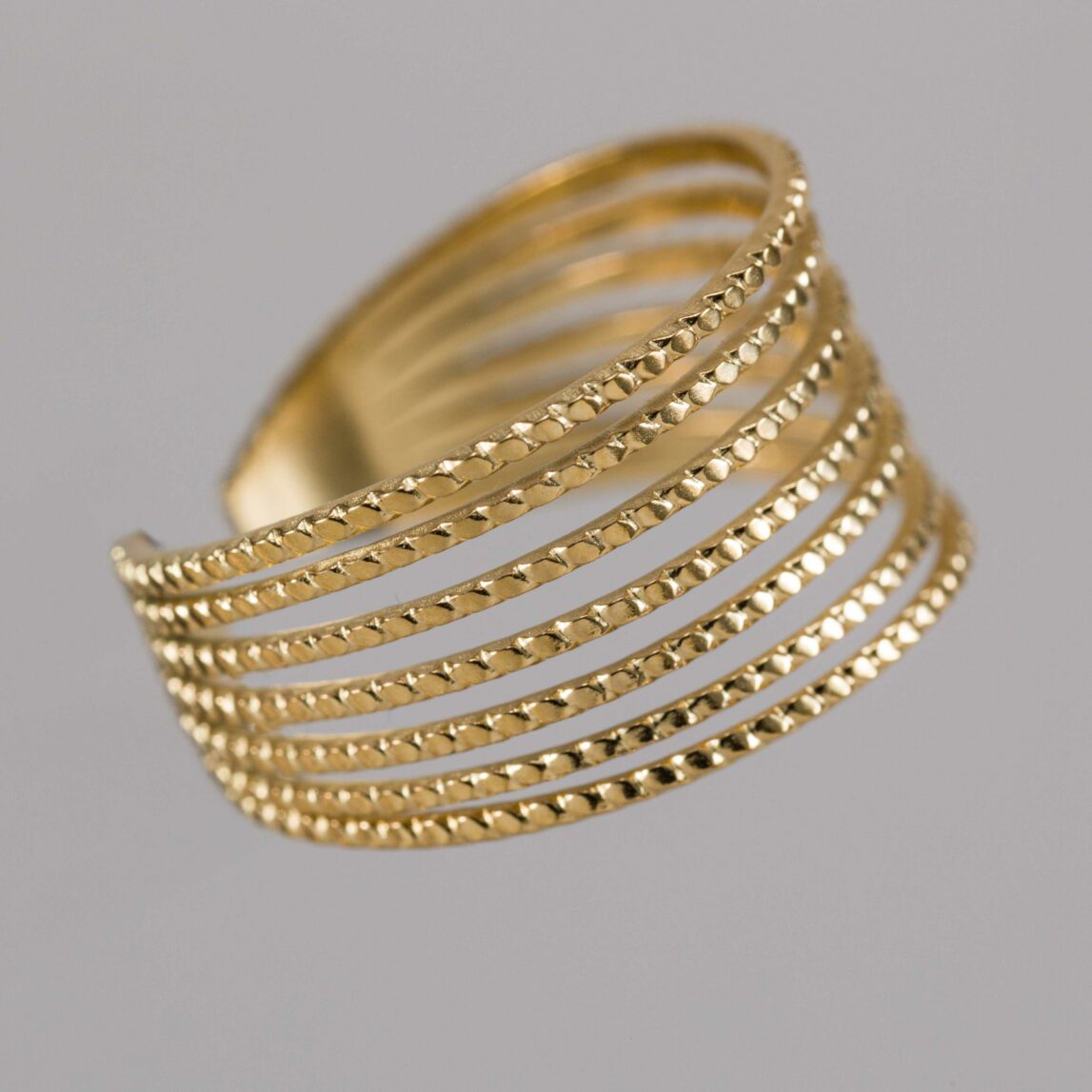 El Anillo Dakota es una pieza llamativa y elegante, parte de la exclusiva Darwin Collection. Su diseño abierto de líneas texturizadas aporta un toque moderno y sofisticado que realza cualquier look.