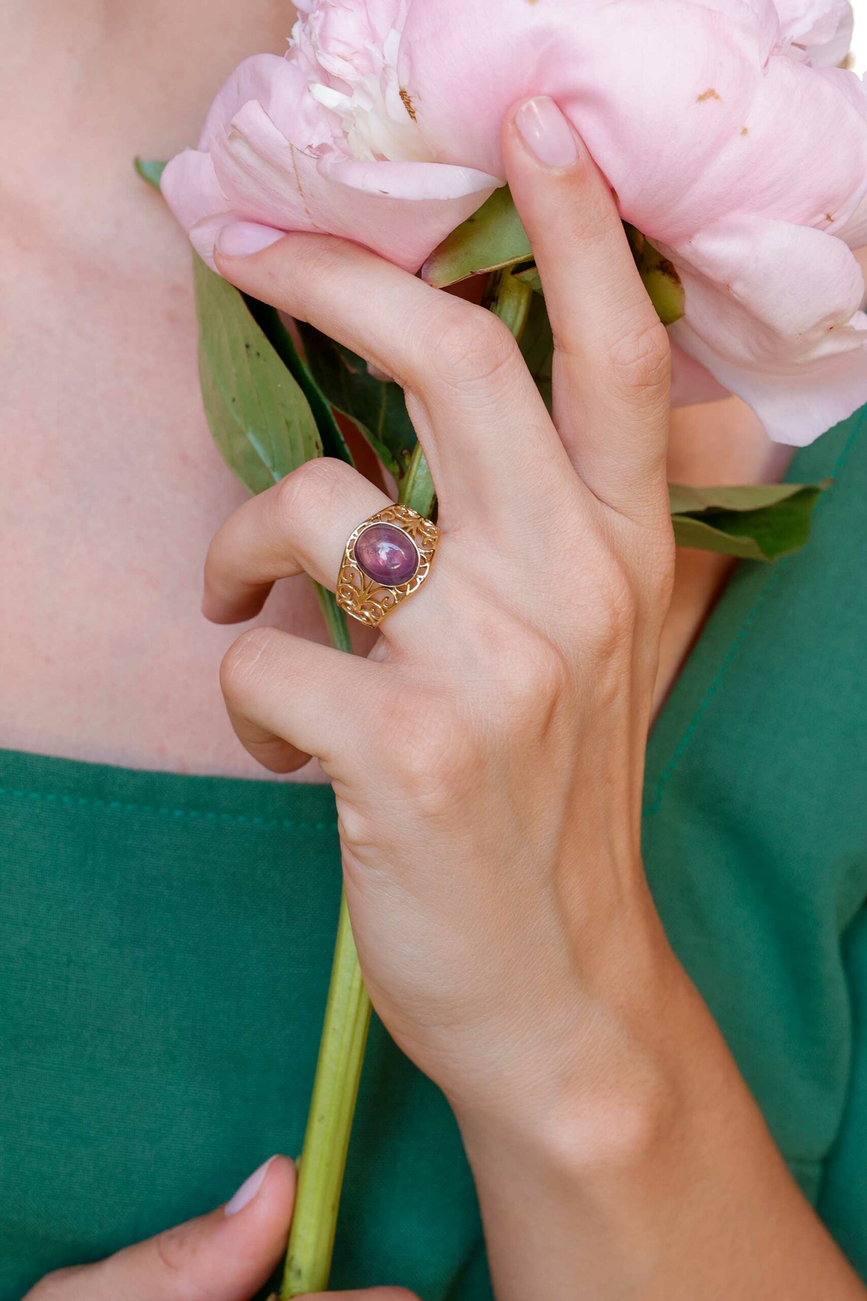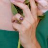 El Anillo Fabiola es ancho y va todo calado con esas filigranas tan bonitas. En el centro, lleva una piedra natural de amatista ovalada, que será el centro de todas las miradas. La amatista es famosa por aportar serenidad y tranquilidad, convirtiendo este anillo en algo más que una simple pieza de joyería. Es un anillo XL, y ya sabes que los anillos grandes están súper de moda esta temporada. Con el Anillo Fabiola, cualquier look que elijas se verá realzado y lleno de estilo.