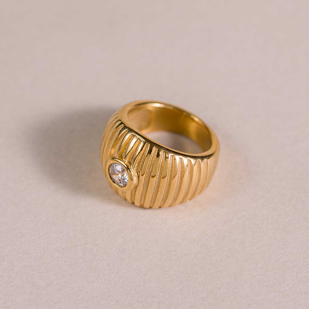 El diseño del Anillo  Filipa es simplemente espectacular. Es un anillo ancho, todo lleno de rayas en relieve que le dan un aspecto moderno y sofisticado. En el centro, una circonita blanca encastrada añade un toque de brillo y distinción.