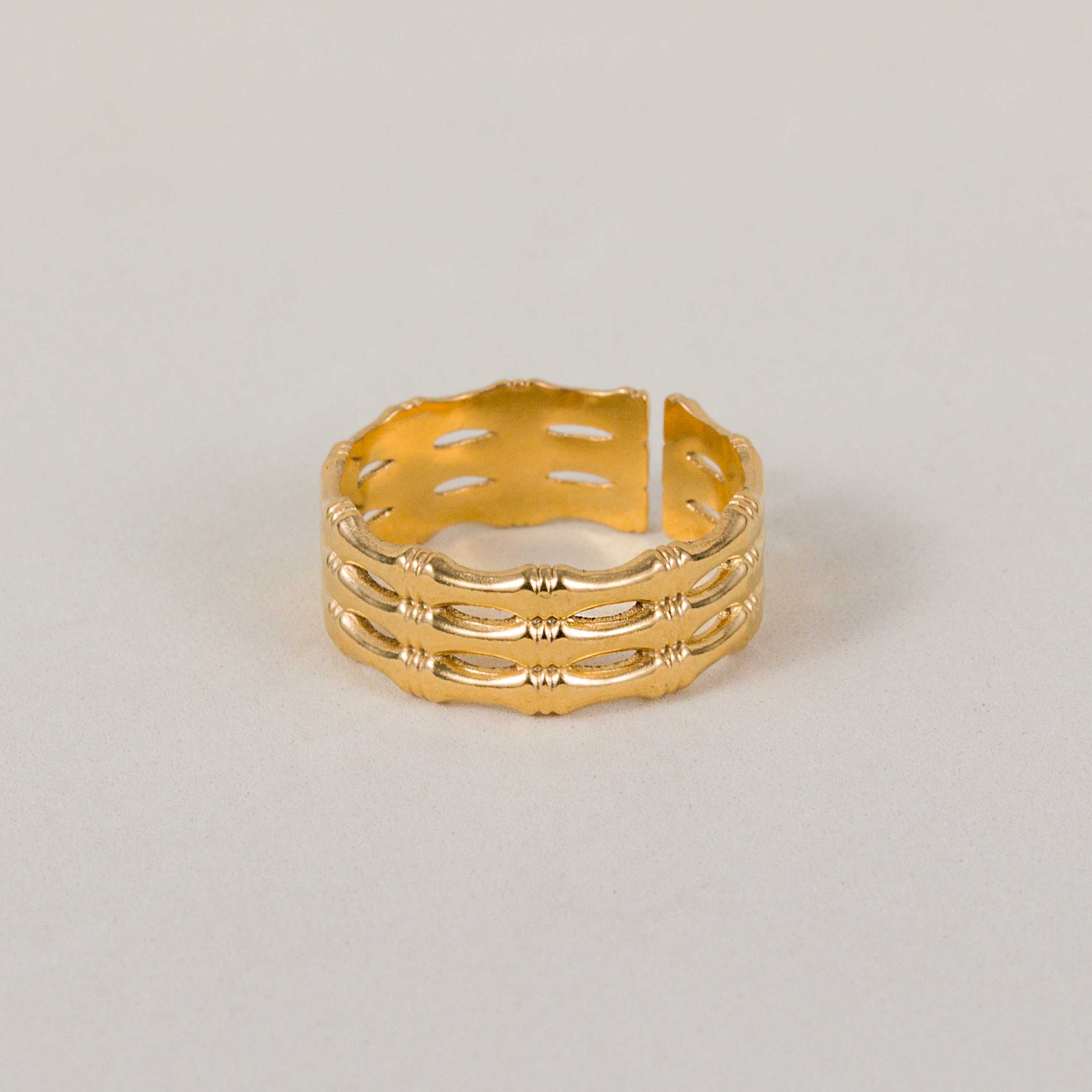 El anillo triple bambú es perfecto para ti que eres amante de las joyas clásicas y atemporales. Este anillo dorado ajustable es el best seller de la temporada