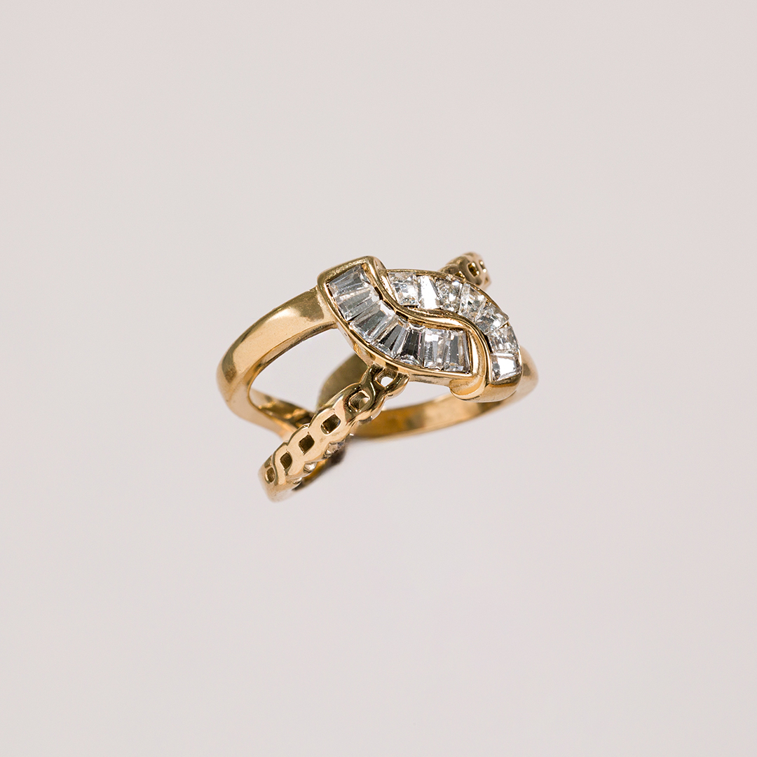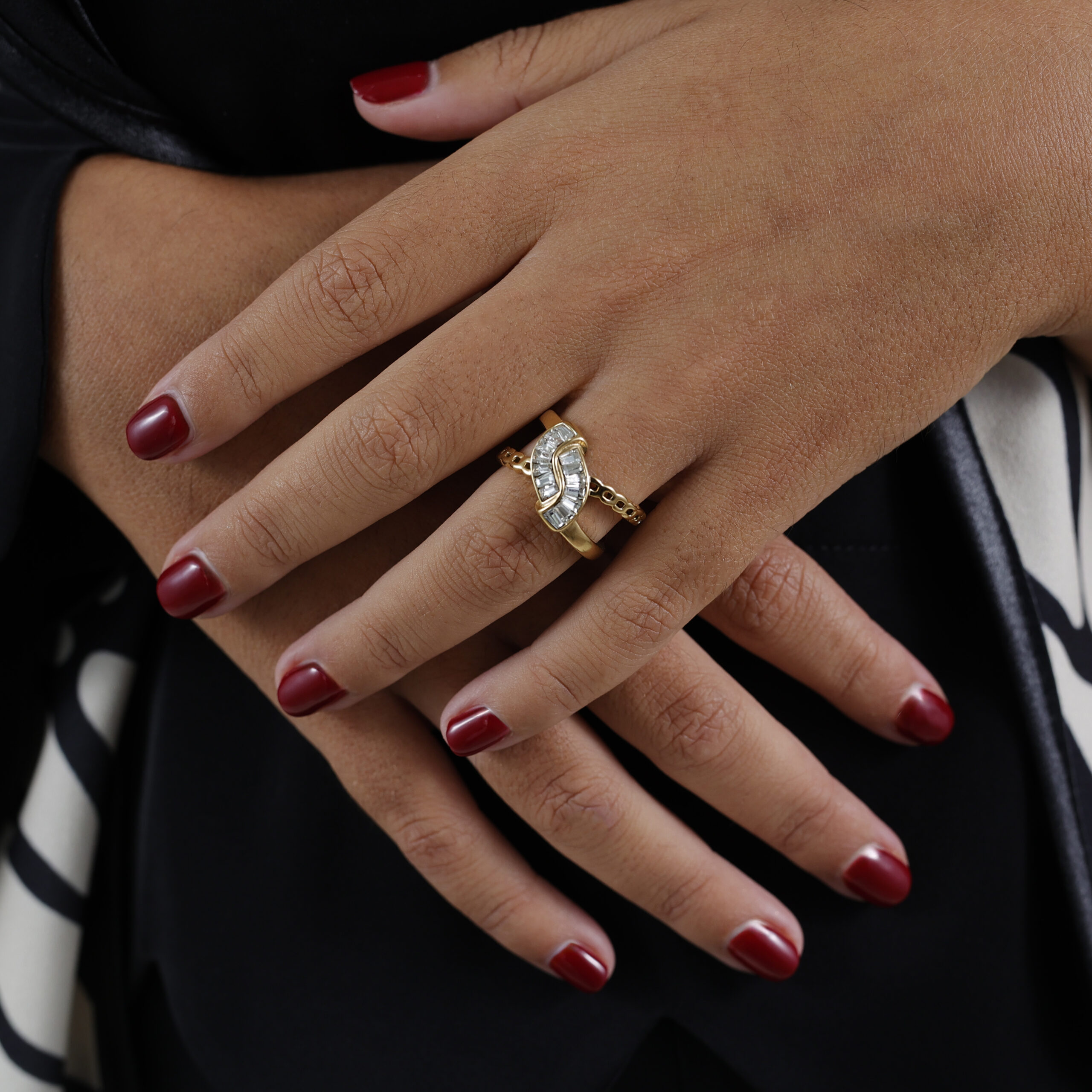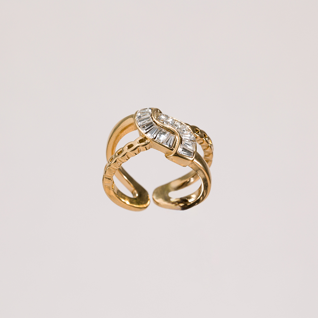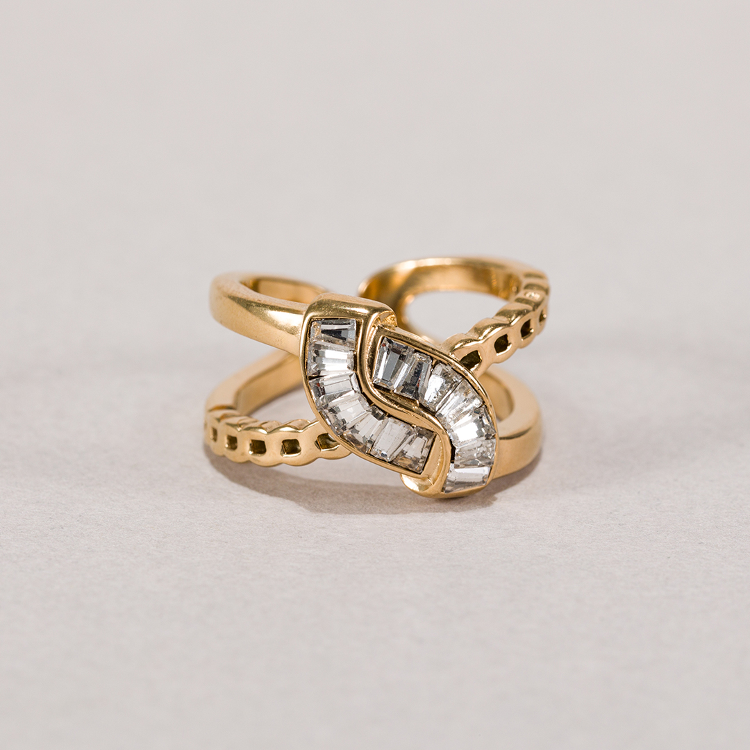 El Anillo Vintage es un diseño de dos aros entrelazados en un nudo es simplemente precioso, y lo que lo hace aún más especial son las circonitas baguette de gran tamaño que adornan la parte frontal.