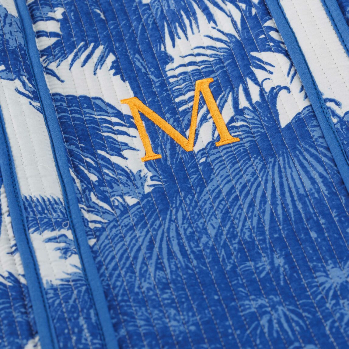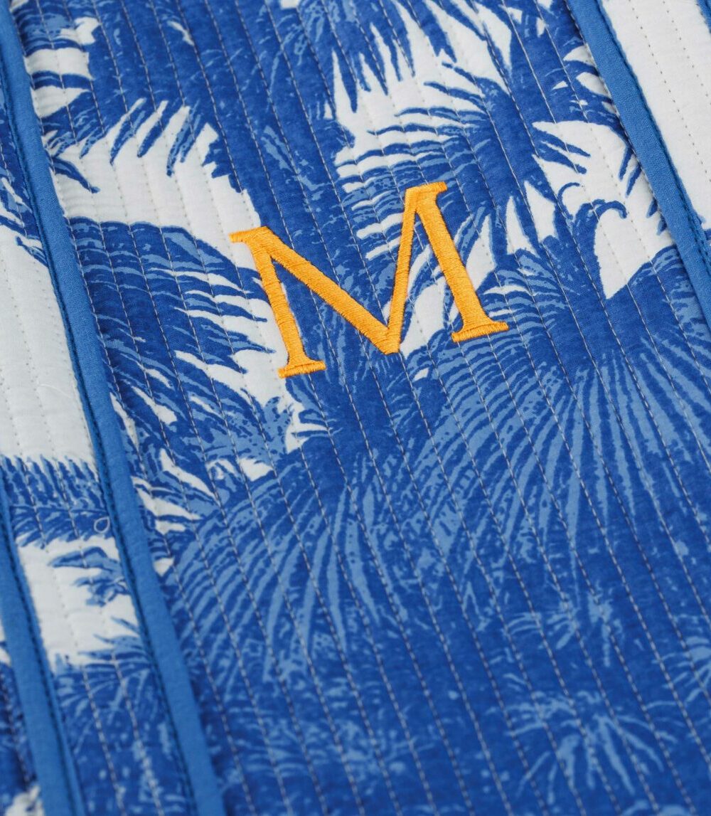 La Bolsa de viaje acolchada Corfú azul está confeccionada en una tela acolchada de algodón importada de la India con un cautivador estampado de palmeras sobre un fondo blanco que seguro llamará la atención wherever you go.
