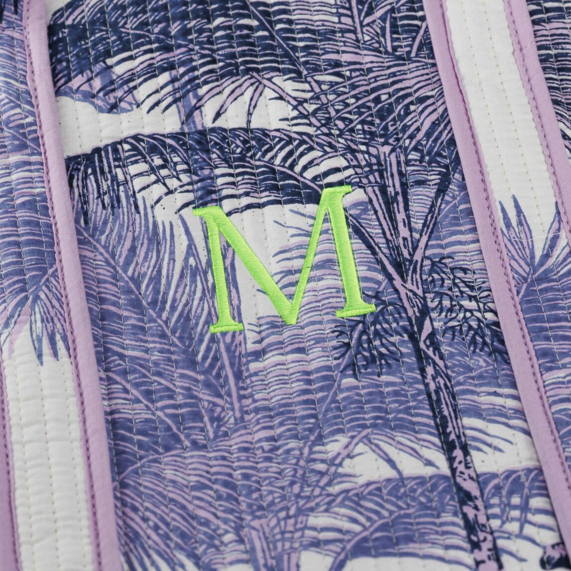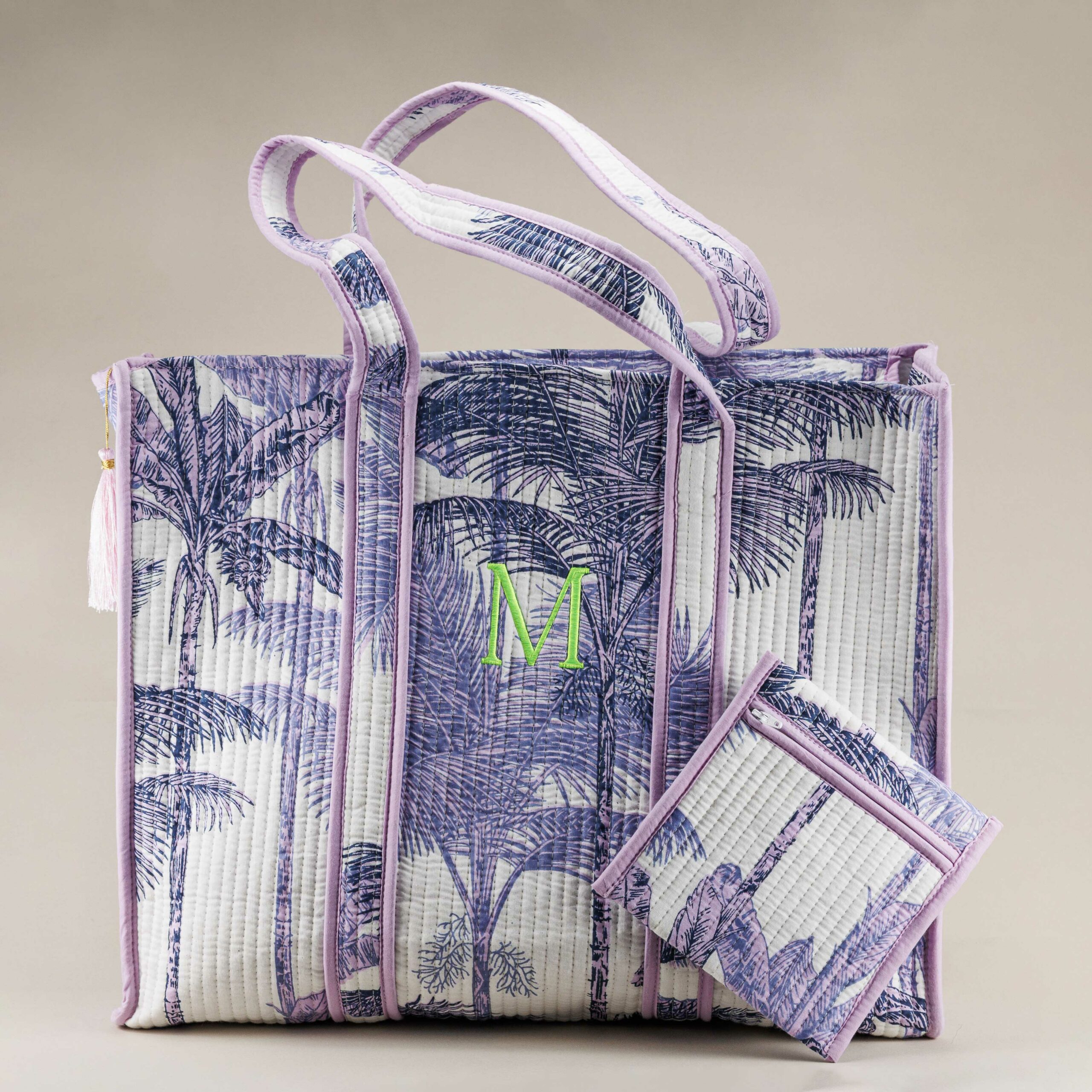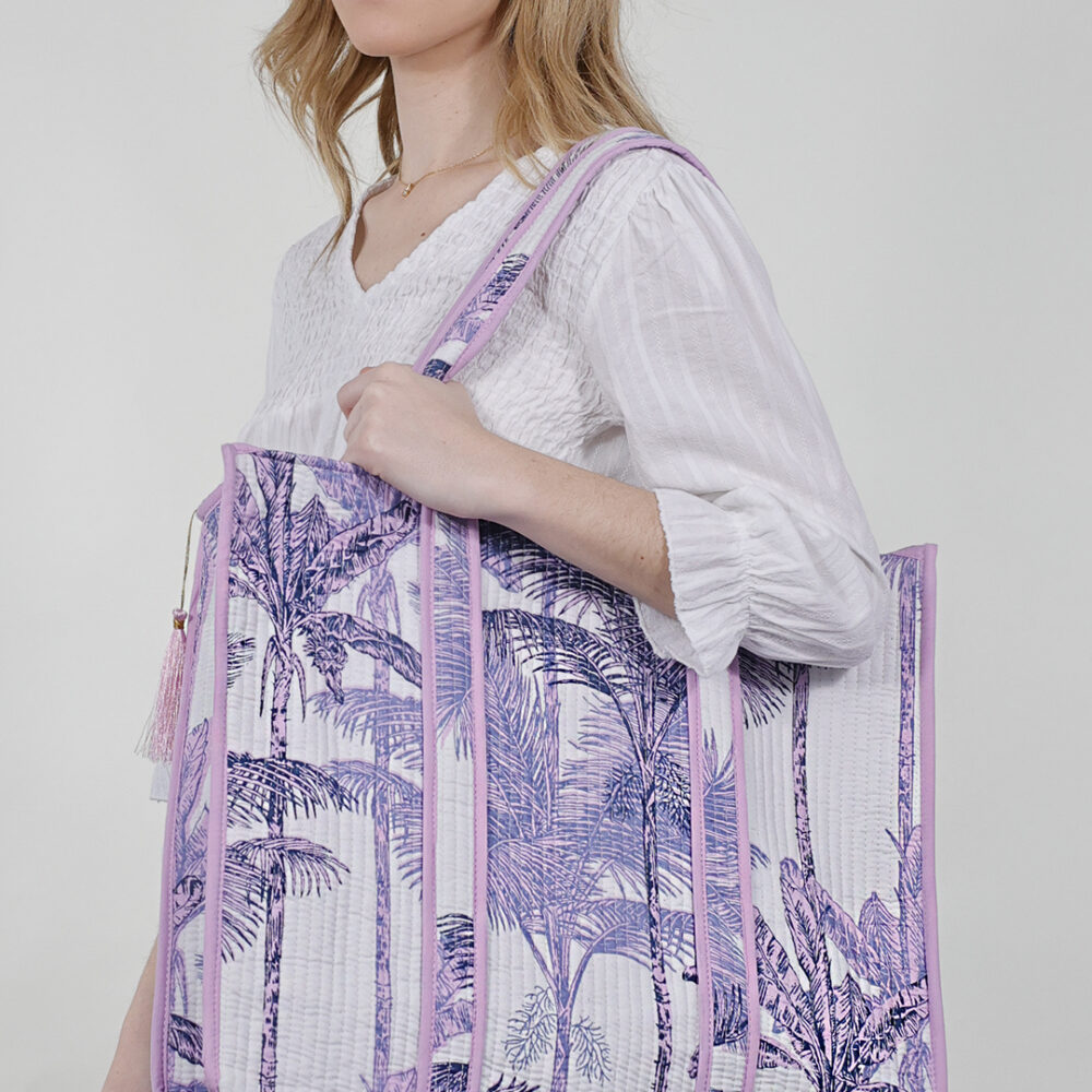 La Bolsa de viaje acolchada Corfú malva está confeccionada en una tela acolchada de algodón importada de la India con un cautivador estampado de palmeras sobre un fondo blanco que seguro llamará la atención wherever you go.