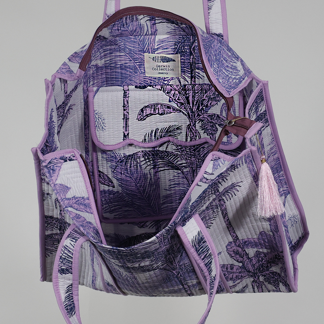 ¡Aventureros y viajeros, atención! Prepárense para conocer la última adición a la familia Darwin: la Bolsa de viaje acolchada Corfú malva. Este impresionante accesorio está confeccionado en una tela acolchada de algodón importada de la India, con un cautivador estampado de palmeras en tonos malva sobre un fondo blanco que seguro llamará la atención wherever you go.