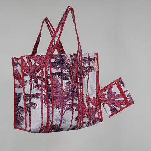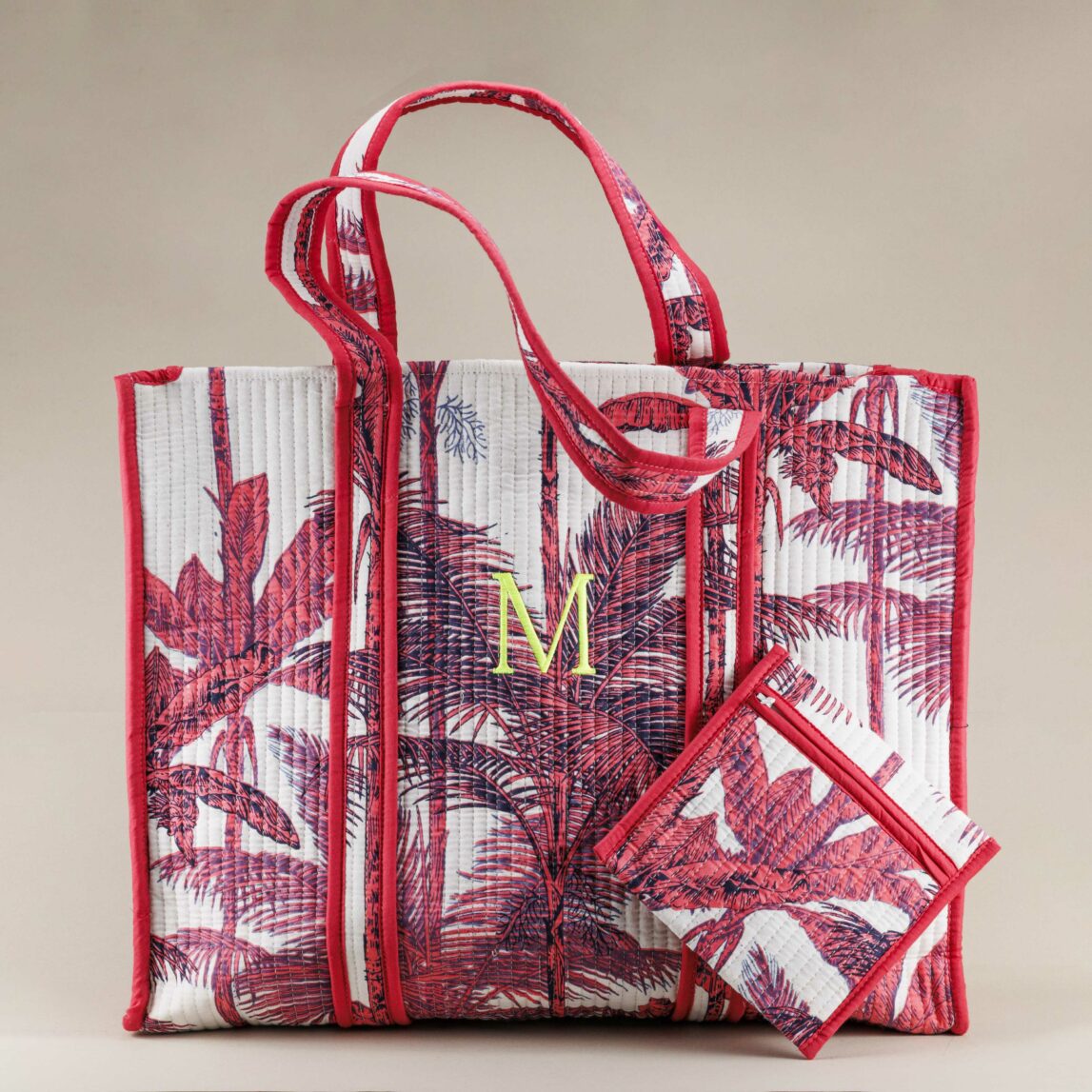 La Bolsa de viaje acolchada Corfú coral está confeccionada en una tela acolchada de algodón importada de la India con un cautivador estampado de palmeras sobre un fondo blanco que seguro llamará la atención wherever you go.