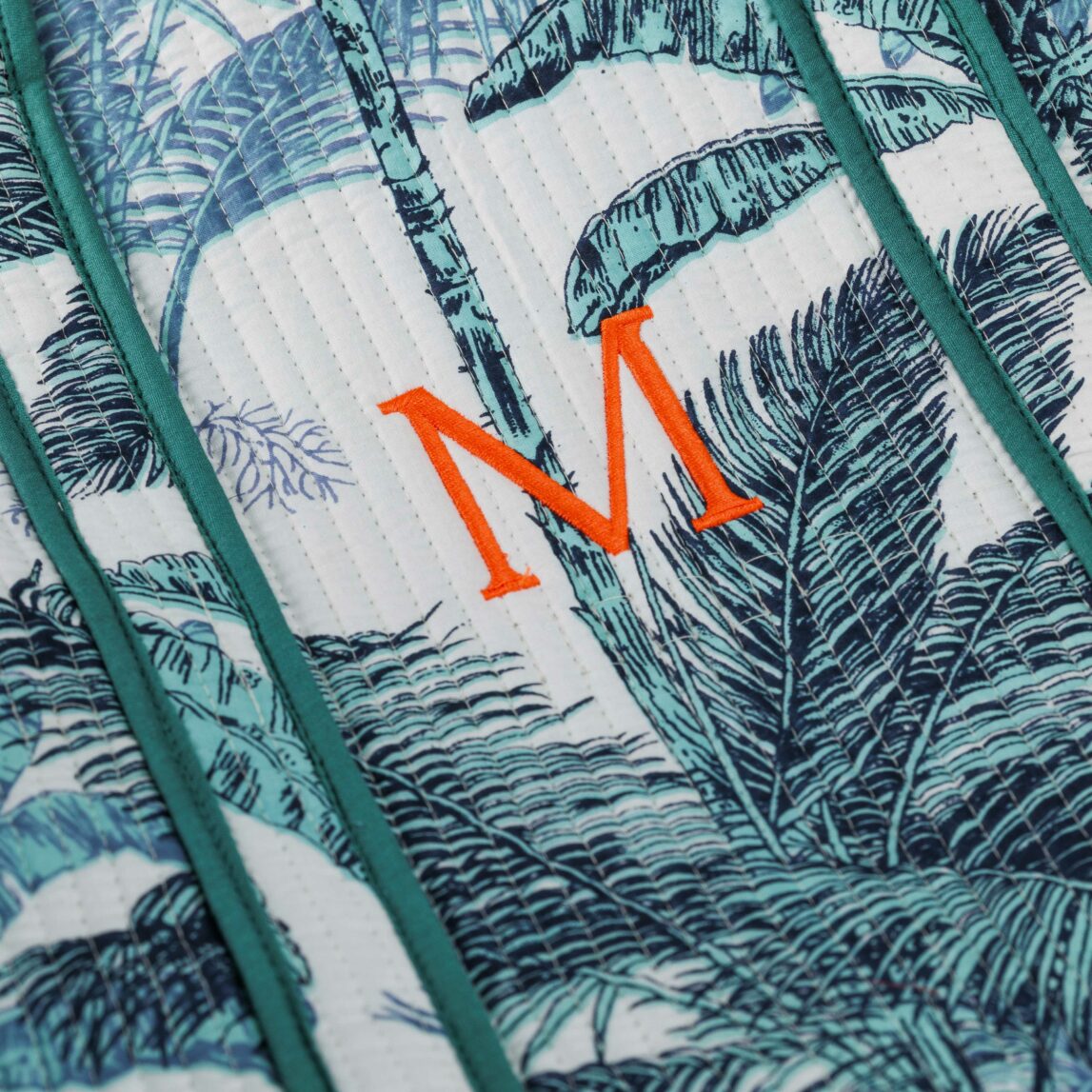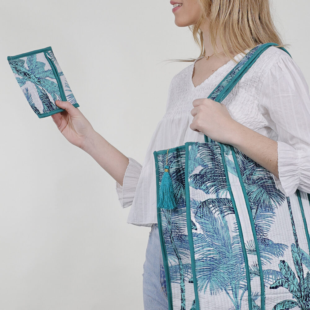 La Bolsa de viaje acolchada Corfú verde está confeccionada en una tela acolchada de algodón importada de la India con un cautivador estampado de palmeras sobre un fondo blanco que seguro llamará la atención wherever you go.