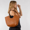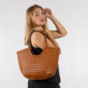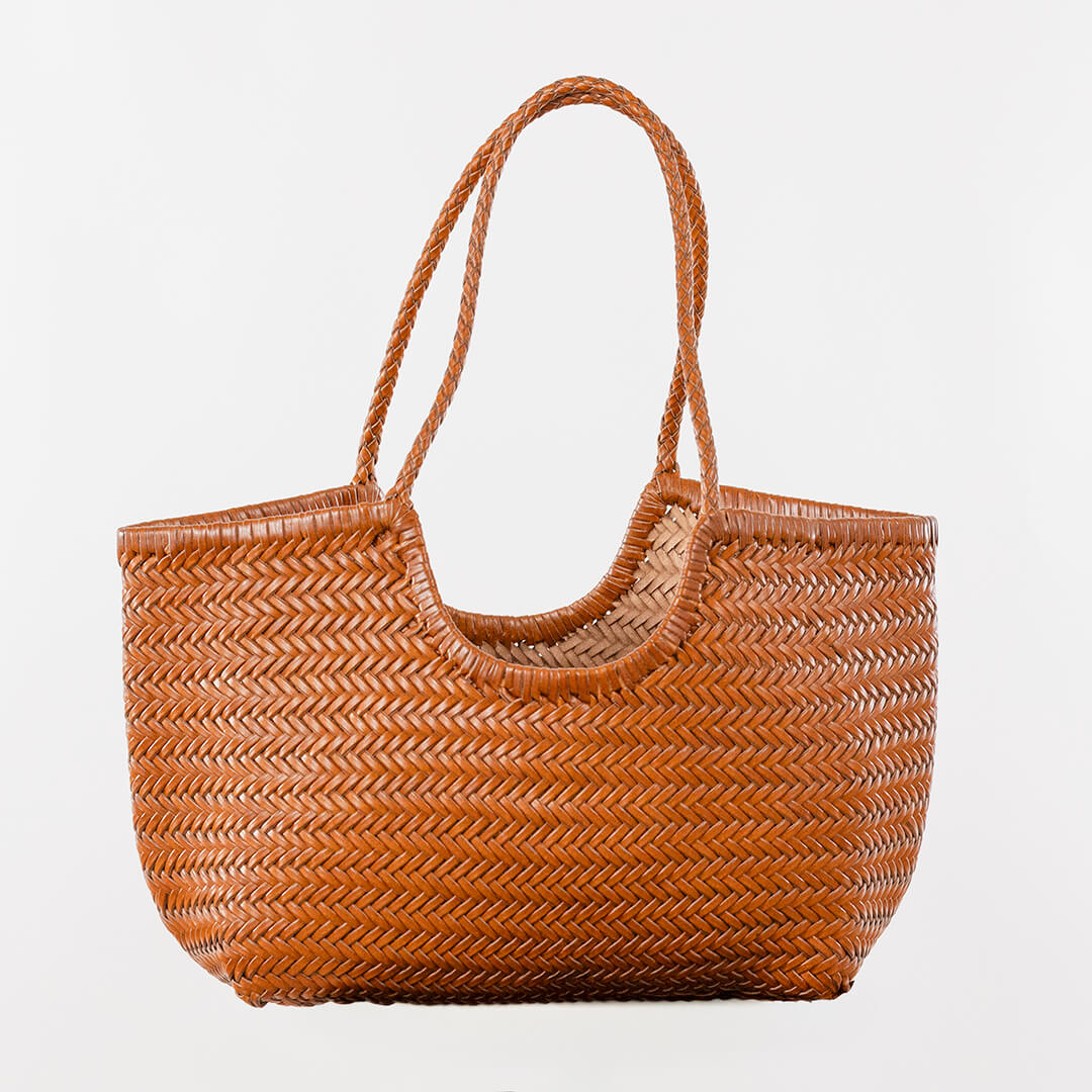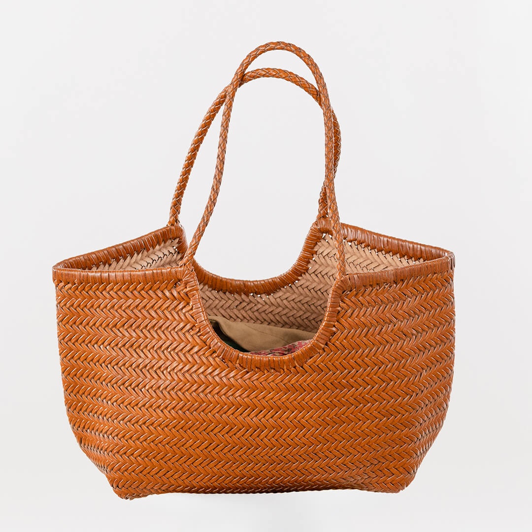 Capazo mediano de piel trenzada 100% auténtica. Incluye saquito interior con cierre y bolsillos. Disponible varios colores: chocolate, verde oscuro, burdeos y tabaco.