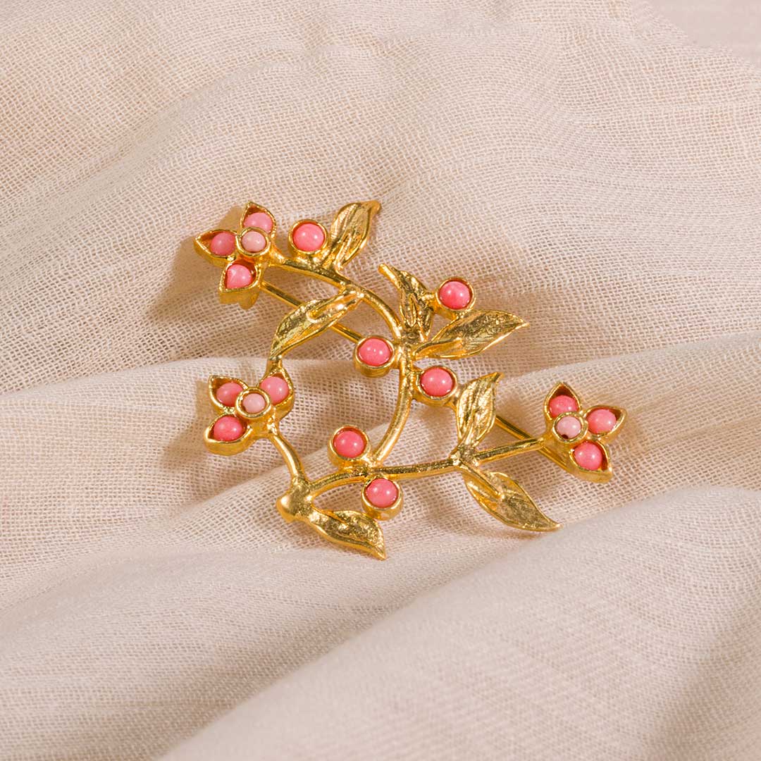 Este broche está fabricado en bronce con un baño en oro de 18 quilates. Es una flor dorada con pequeñas piedras naturales redondas de coral dentro de cada hoja. ¡Imagina el brillo y el esplendor que añadirá a tu outfit!