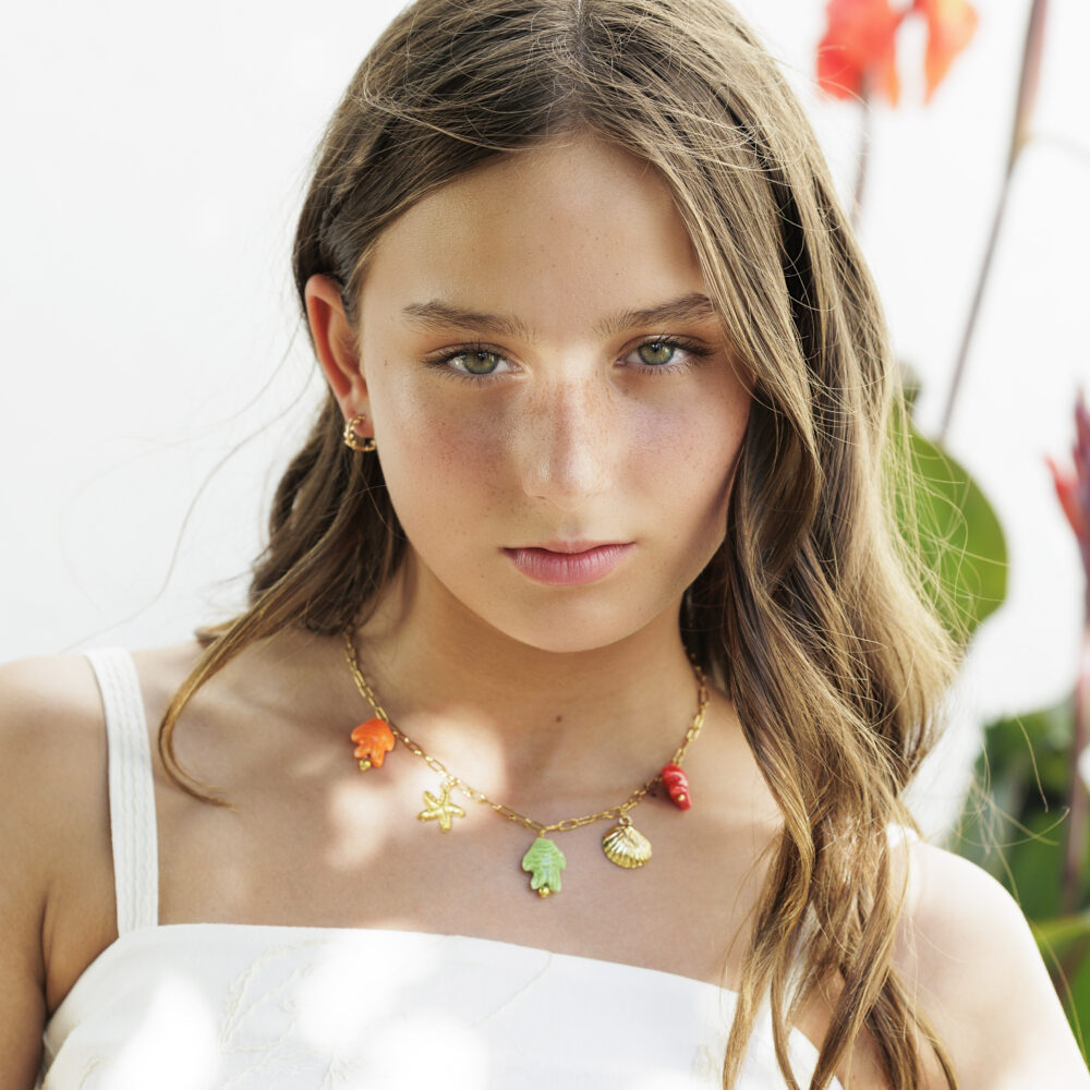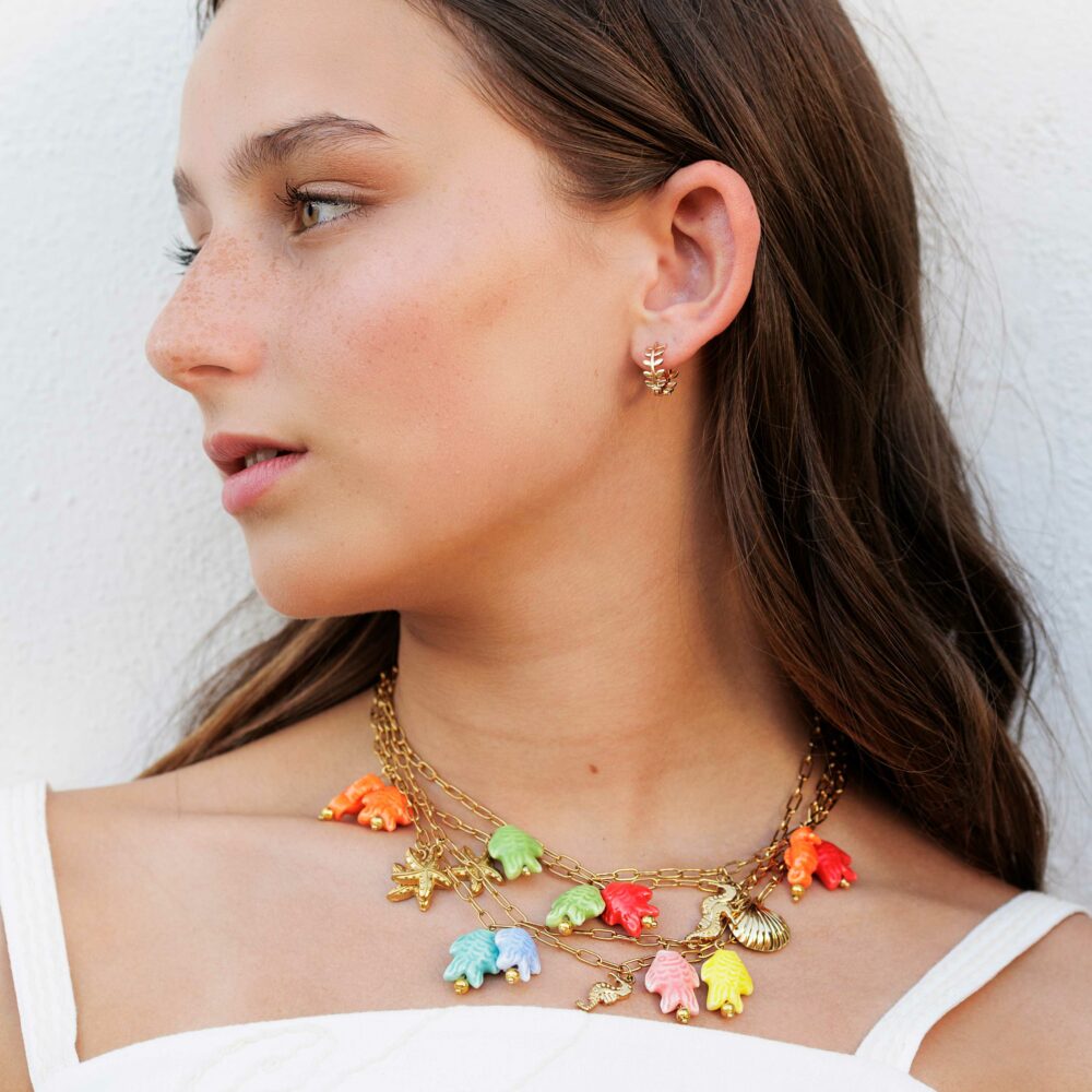 La Cadena Holiday es una cadena dorada con multicharms con motivos marinos y veraniegos de colores, ideal para looks de verano. Te aconsejamos combinar varios modelos para dar mucho más protagonismo a tus complementos; opción perfecta para lucir con palabra de honor y outfits blancos.