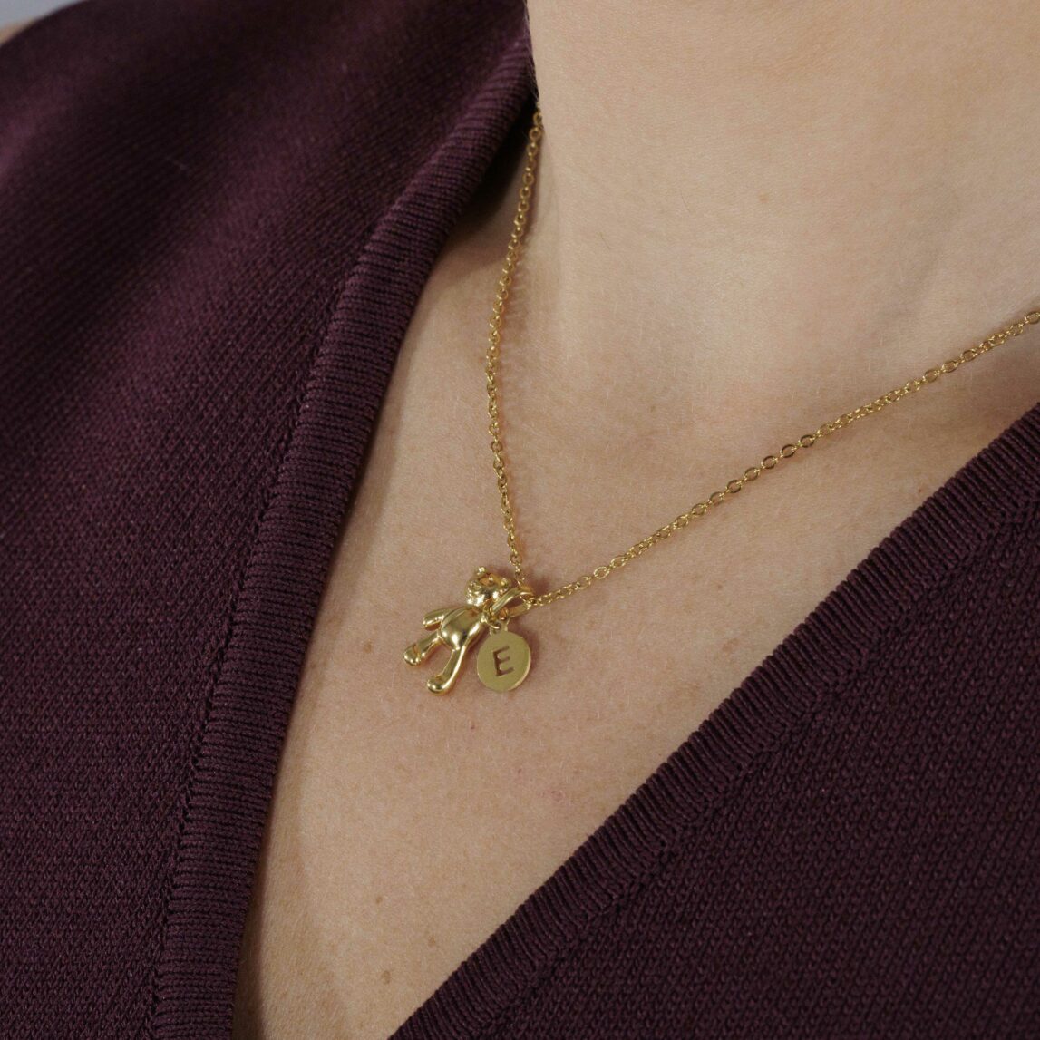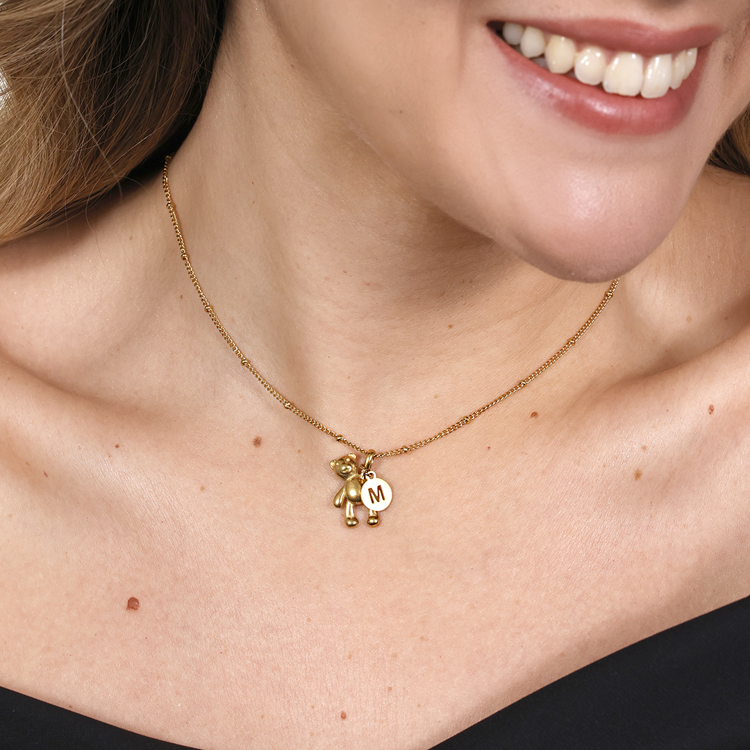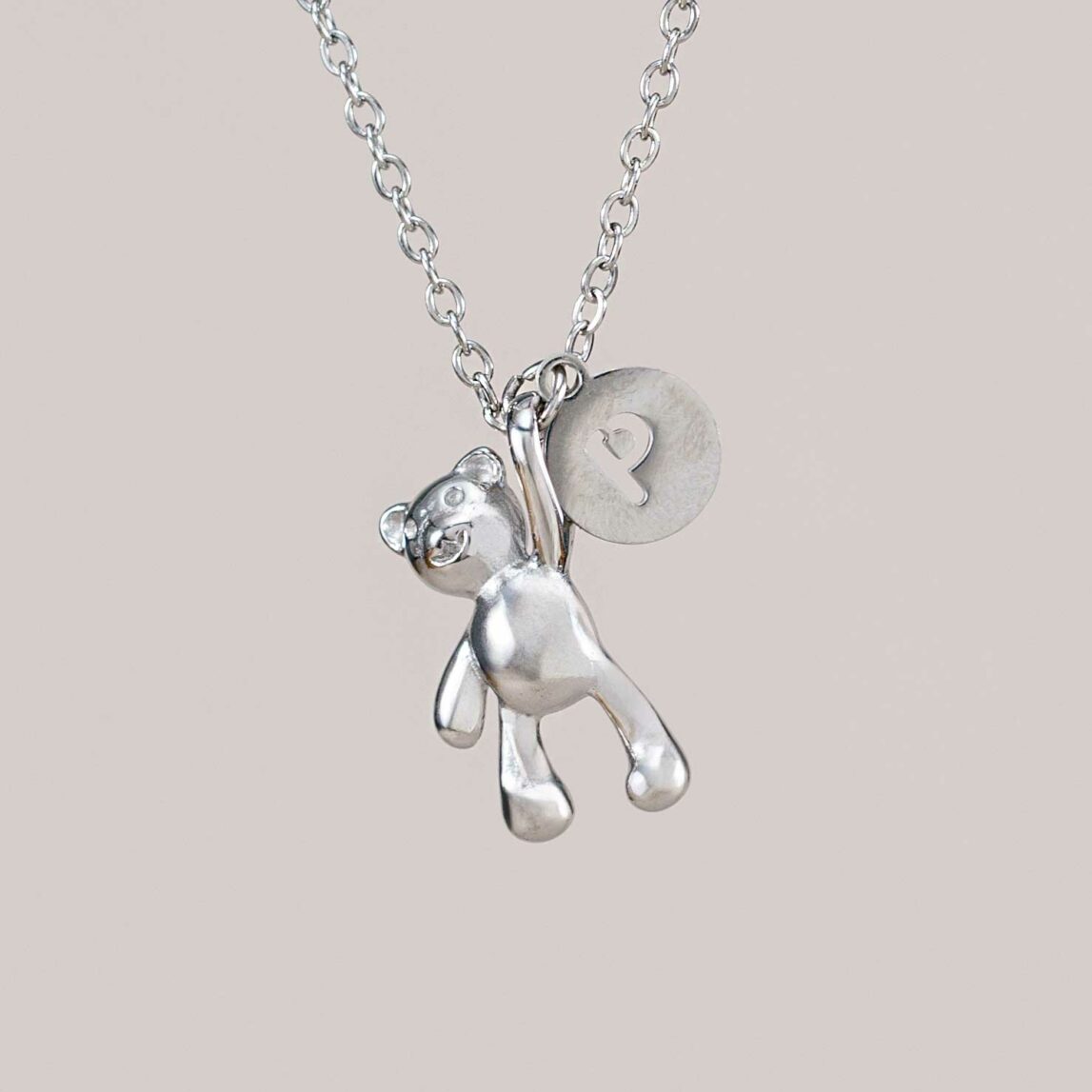 Este diseño cuenta con una cadena estilo Briana con un adorable colgante de un osito Teddy. ¿Por qué un osito Teddy? Porque nos recuerda a esos momentos de nuestra infancia, a ese compañero inseparable que nos acompañaba en cada aventura. El osito lleva una mano levantada, en la que hemos decidido colgar la inicial de tu hijo o incluso la de esa persona especial.