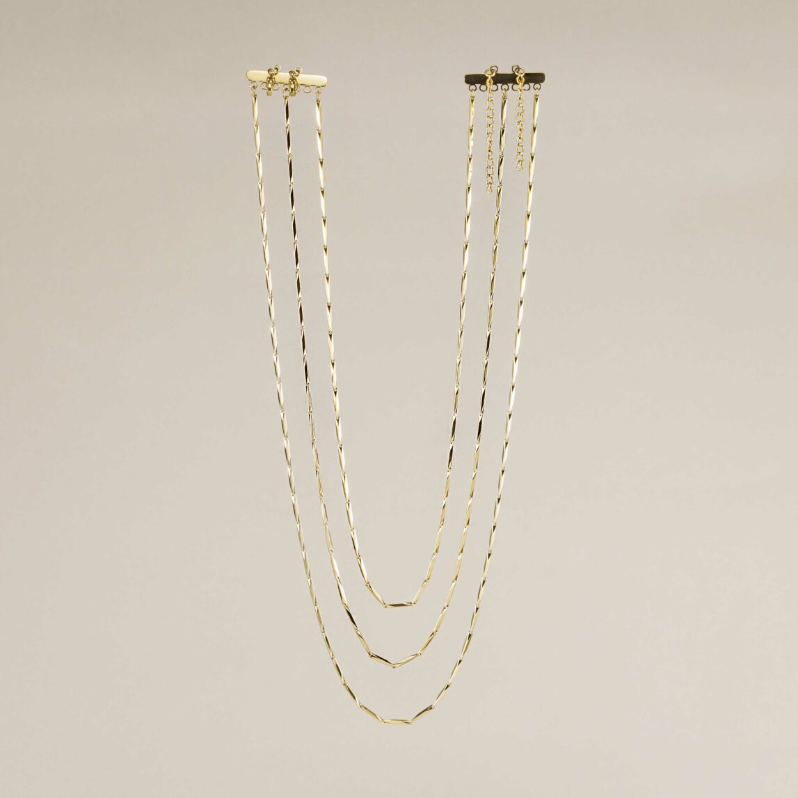 La Cadena Triple Barras es ese básico todoterreno que no puede faltar en tu joyero. Elegante, versátil, ligera y actual. Si te gusta ir bien vestida sin complicarte la vida, esta cadena es para ti.