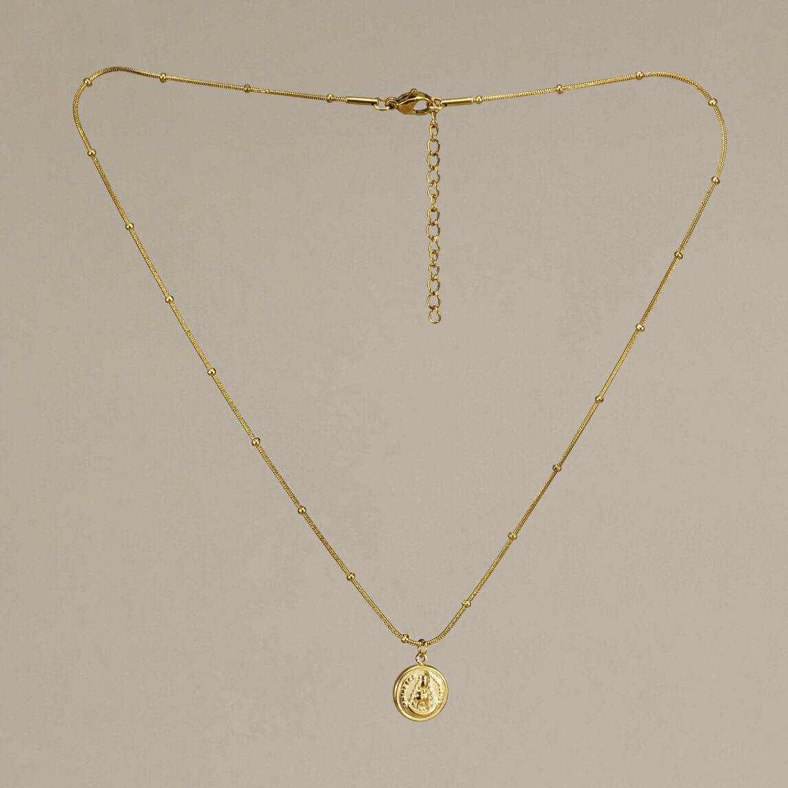 Cadena semirrígida con bolitas y medalla de la Virgen del Rocío. Acero dorado waterproof, hipoalergénica y ajustable. ¡Ideal para combinar!