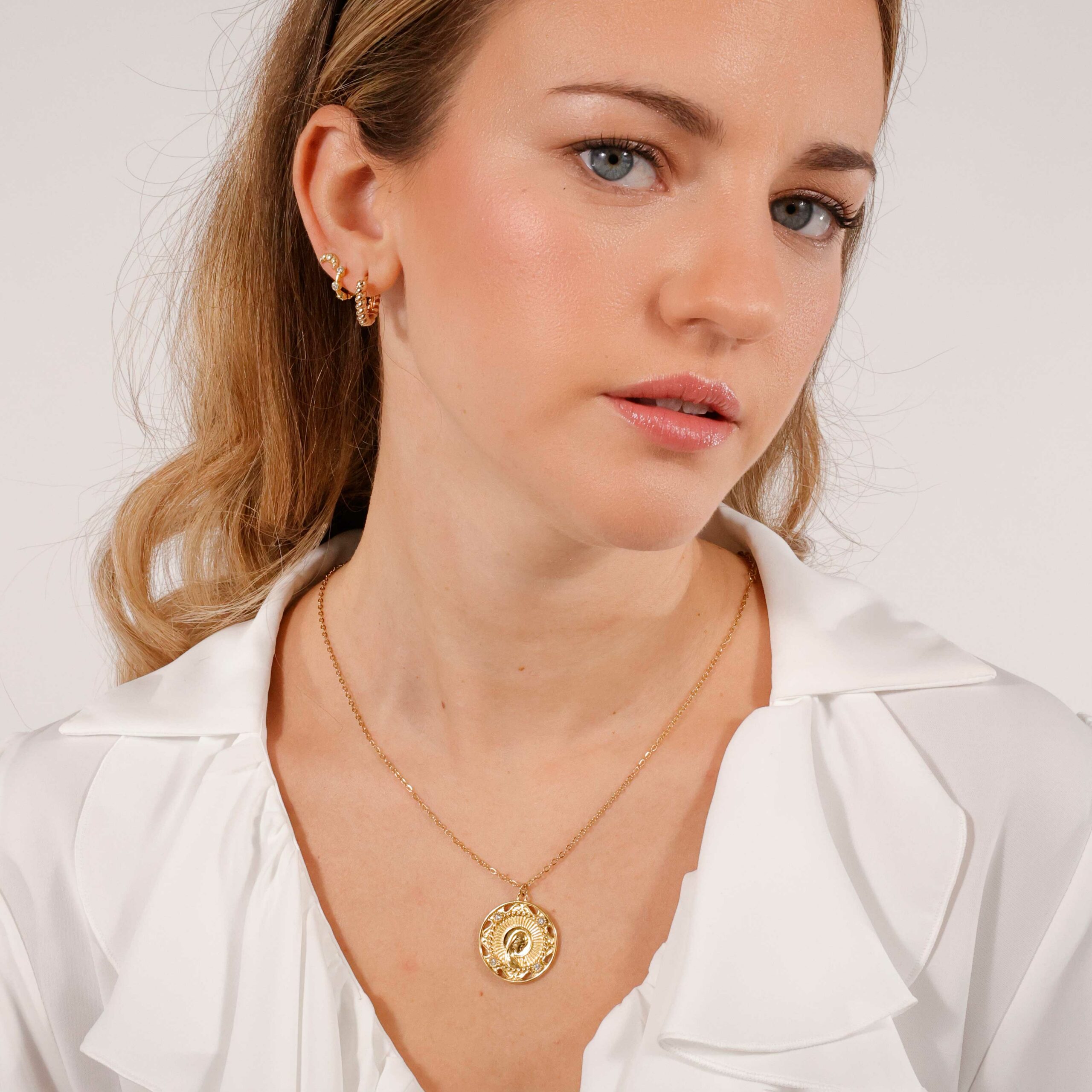 La Cadena Virgen María circonitas es una cadena sencilla tipo pilar y lleva un medallón calado con cuatro circonitas blancas.  Está fabricada acero inoxidable siendo perfecto para pieles sensibles y/o alérgicas. Es una pieza resistente al agua.