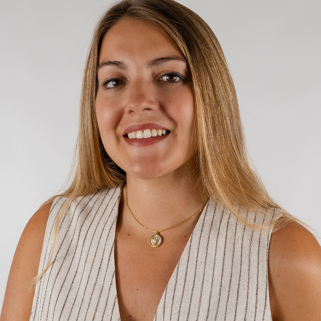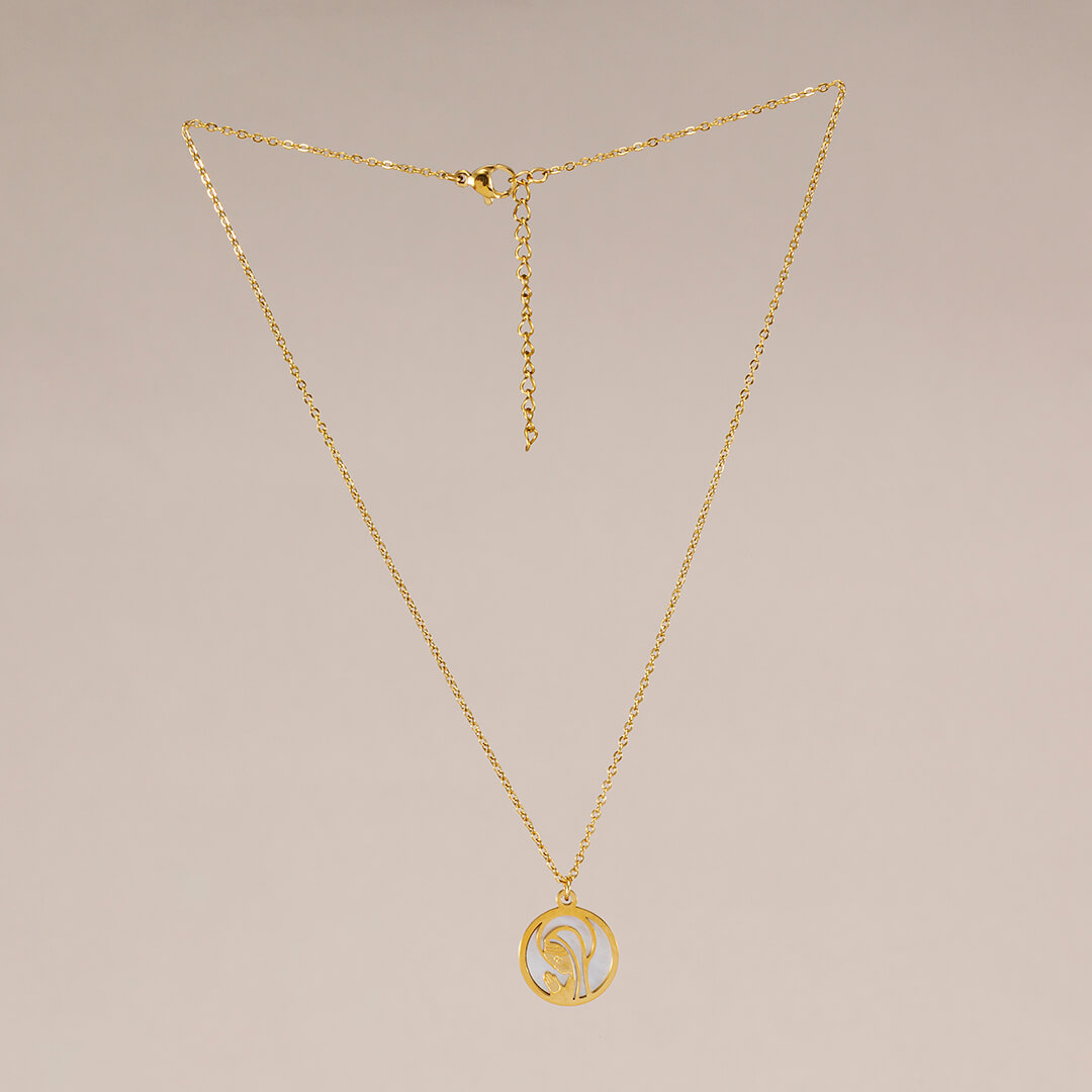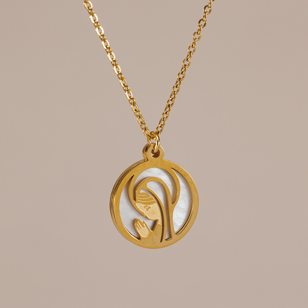 Un colgante en acero inoxidable dorado con nácar, hipoalergénico y resistente al agua. Un detalle lleno de fe y ternura, perfecto como regalo de nacimiento o primera comunión.
