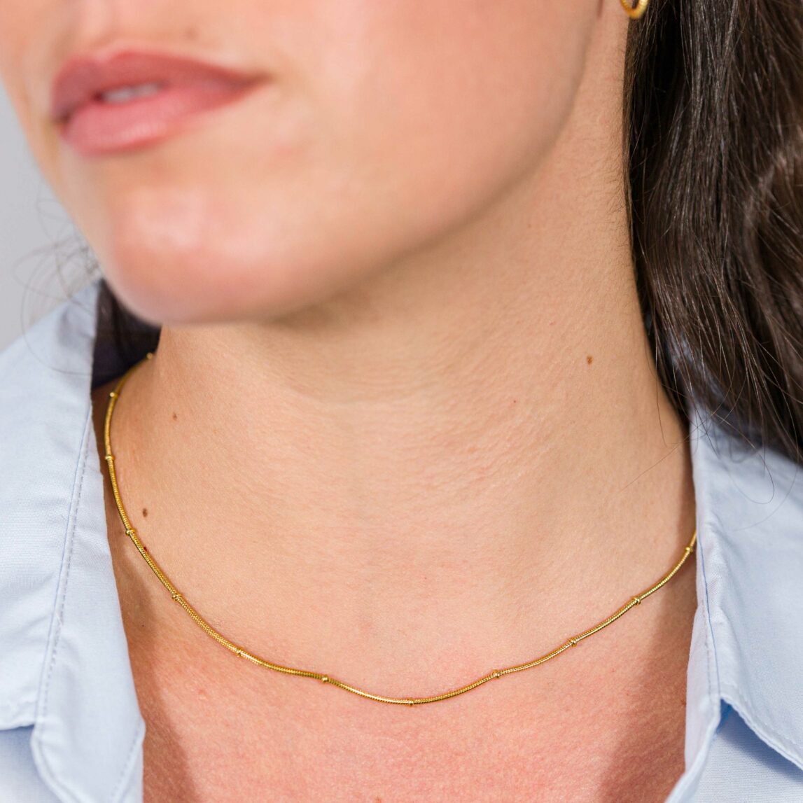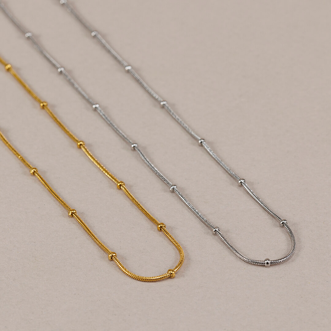 La Cadena Caribe es ese tipo de joya que parece sencilla, pero lo tiene todo. Si eres de las que ama los básicos con rollo, esta cadenita tipo cola de ratón va a ser tu nueva favorita. Es una cadena semirrígida, súper cómoda, con mini bolitas doradas fijas engarzadas a lo largo. ¿El resultado? Un diseño delicado, minimalista y muy elegante, que combina con absolutamente todo.