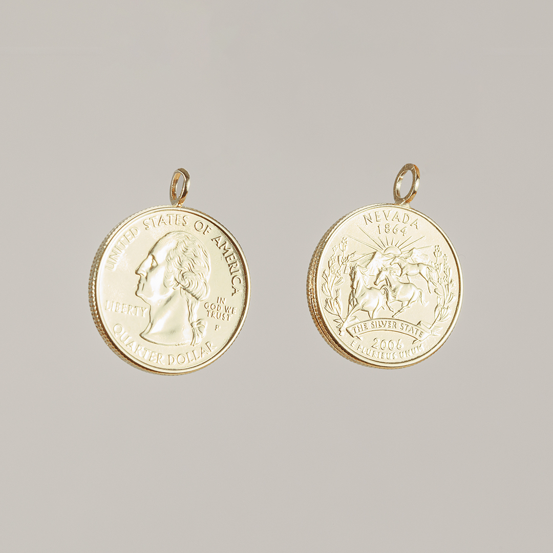 Este charm es una réplica de una moneda de dólar americano, hecha con la fascinante técnica de electroforma en plata 925 y bañada en oro de 18 quilates.