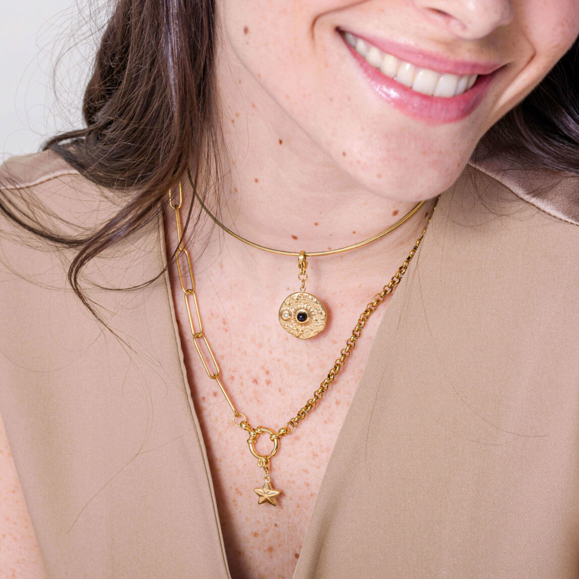 Cada medalla incluye una piedra natural cuidadosamente seleccionada, lo que aporta un toque de energía y color a cada joya. Ten en cuenta que, al tratarse de piedras naturales, el tono puede variar ligeramente, lo que convierte cada charm en una pieza completamente única.