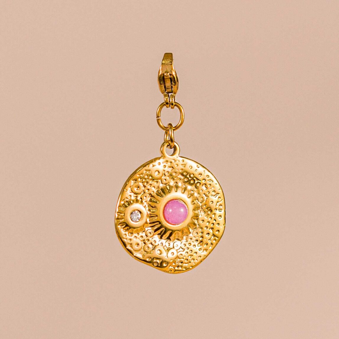 Su diseño redondo y trabajado al detalle evoca la riqueza cultural de la antigua Grecia, mientras que el engaste central con la piedra aporta fuerza y personalidad. El charm cuenta con un práctico cierre de mosquetón dorado, lo que te permite colocarlo fácilmente en pulseras, collares o aros.