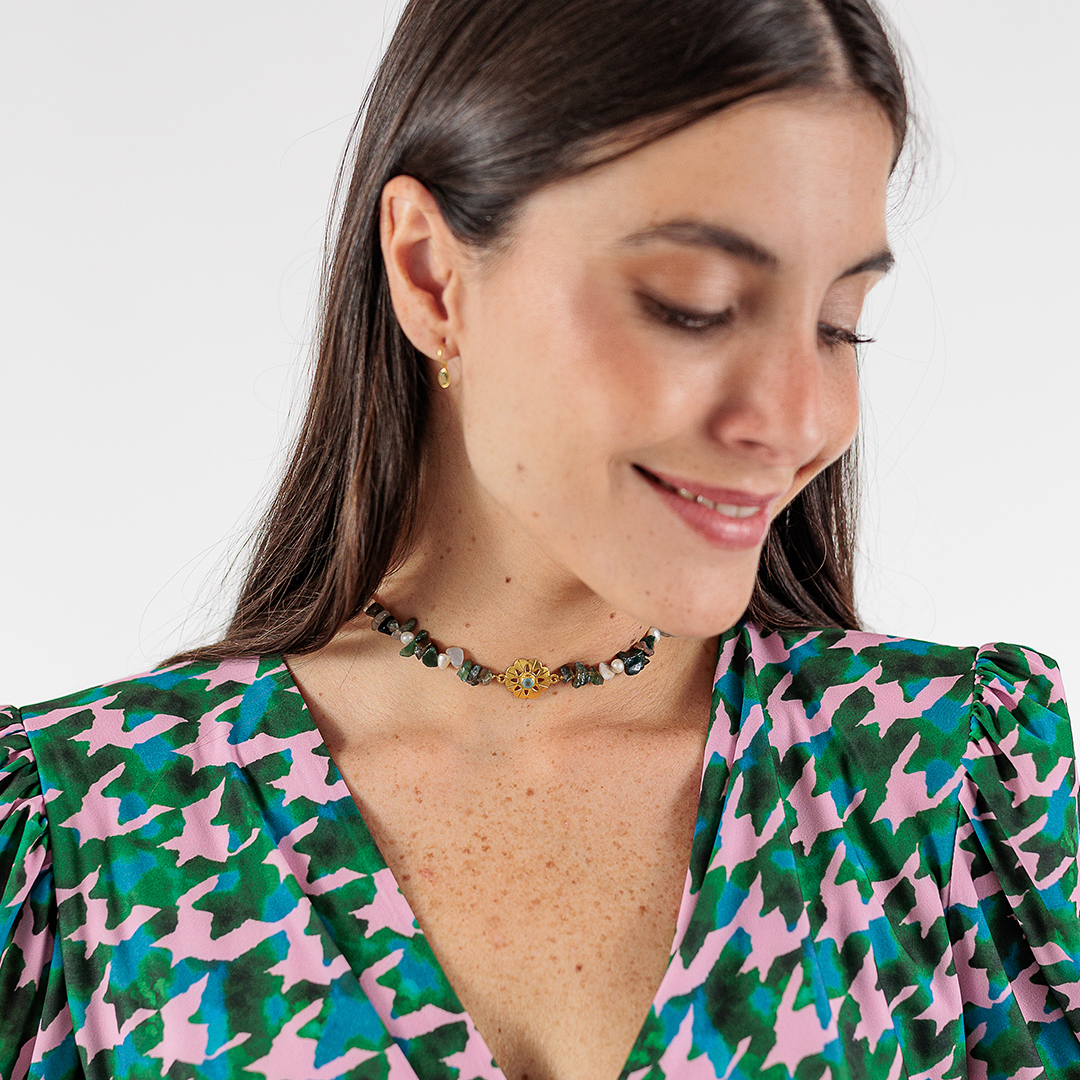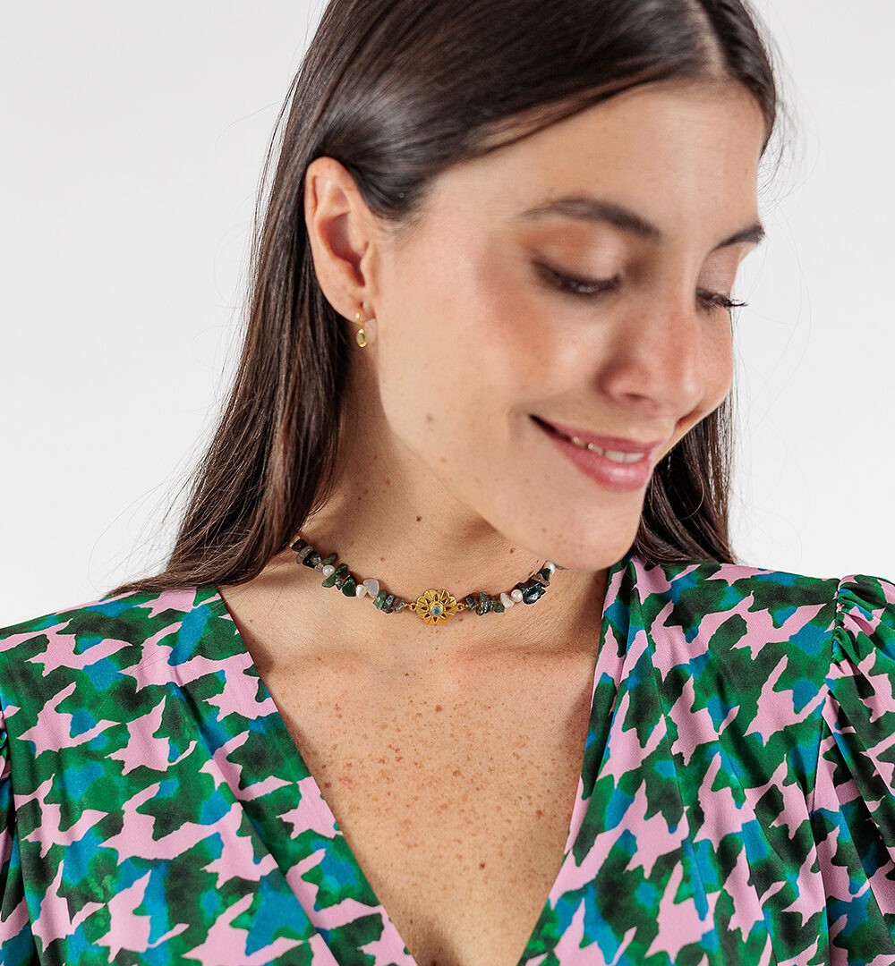 El Choker Amina Verde combina elegancia y modernidad en un diseño delicado y versátil. Fabricado en plata con baño de oro, ofrece un acabado brillante y duradero que aporta un toque de frescura y sofisticación a cualquier look, desde el día a día hasta ocasiones especiales.