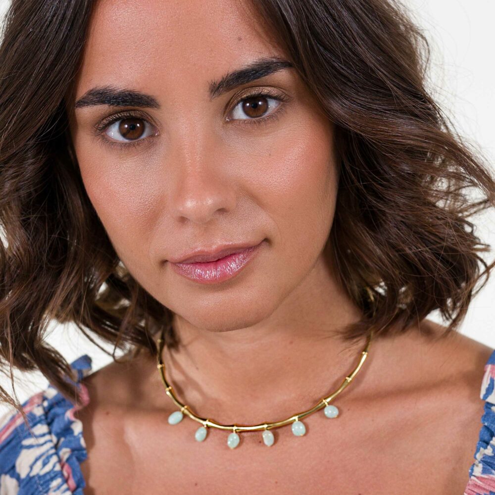 El Choker Bambú es una cadena rígida dorada que descansa en las clavículas con pequeñas piedras naturales de coral rojo, verde amazonita, blanco con perla de río, granate con ágata y negro con obsidiana.