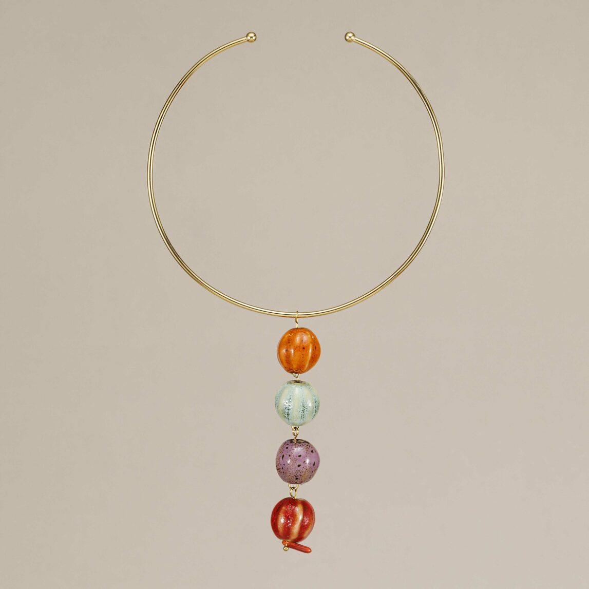 Fabricado en acero inoxidable hipoalergénico, este choker es perfecto para pieles sensibles, ya que garantiza comodidad y durabilidad sin sacrificar el estilo. Su diseño incorpora piezas de cerámica esmaltadas en colores como naranjas, malvas o azules, aportando una fusión de texturas y tonos que evocan el espíritu del Mediterráneo: cálido, luminoso y lleno de vida.