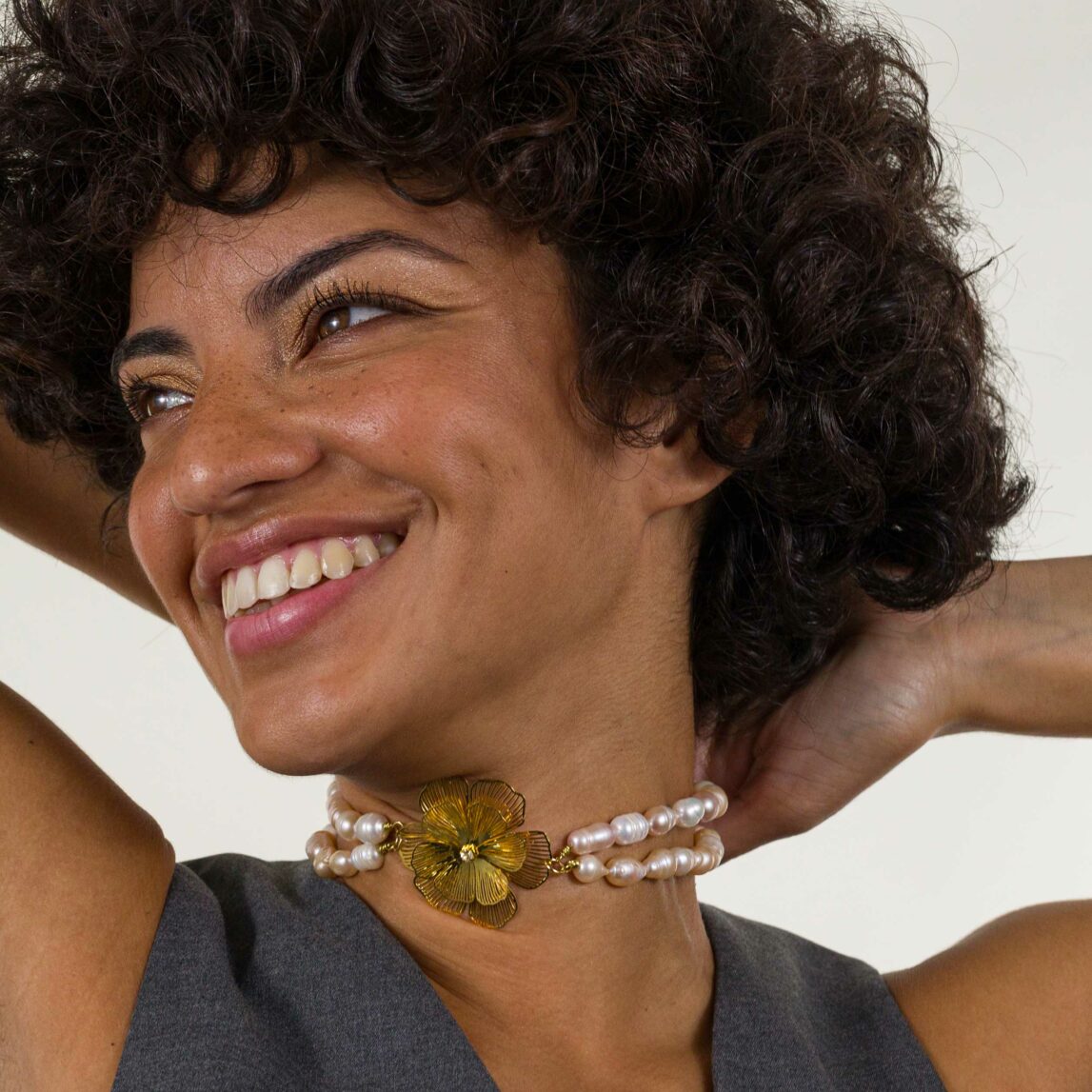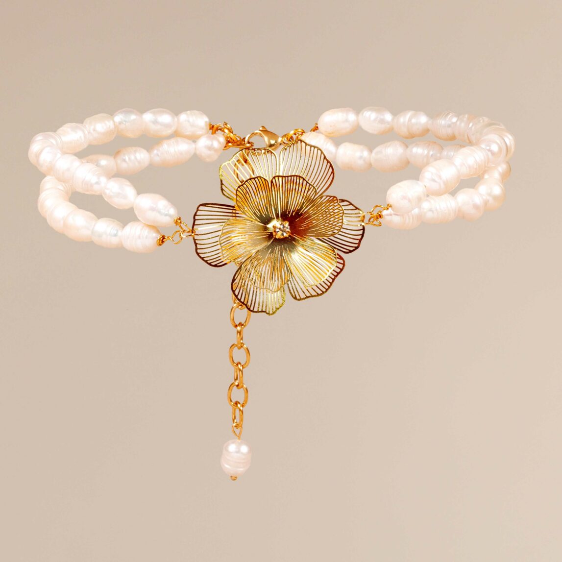 Este diseño lleva en medio una flor dorada calada con una circonita blanca en el centro .Del centro salen dos líneas de perlas de agua cultivadas en color blanco de un tamaño mediano.
