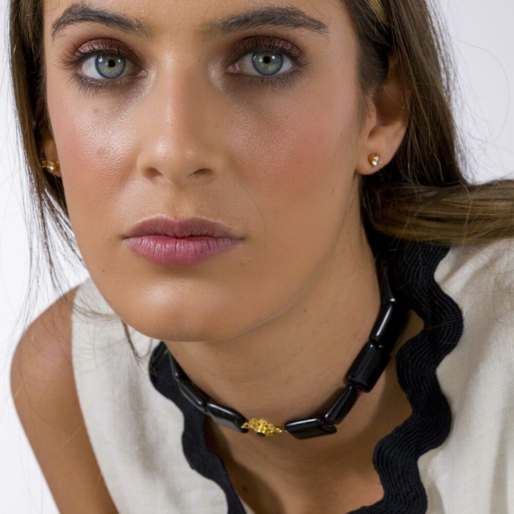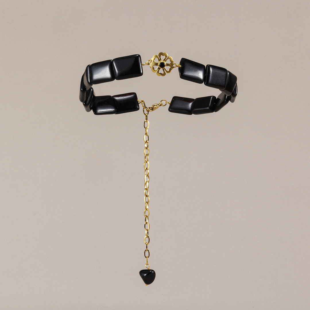 El Choker Casablanca es una joya artesanal única, con un broche de plata 925 bañada en oro de 18k y circonita negra. Cada pieza es distinta. Lleva piedras naturales en forma cuadrada, cierre de mosquetón y alargador. Perfecto para eventos o para dar un toque especial a tu look diario. ¡Versátil, elegante y super en tendencia!