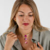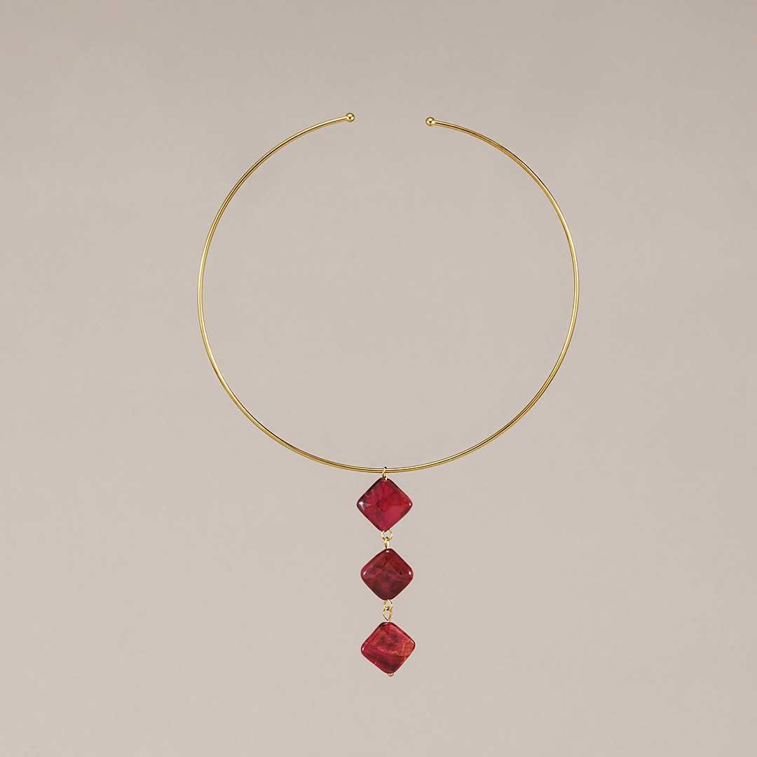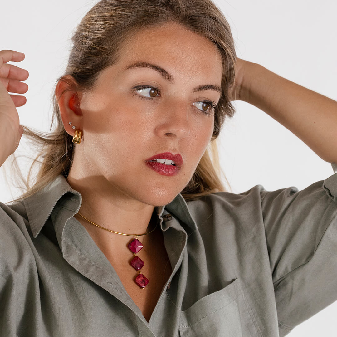 El detalle que lo convierte en una pieza única son sus tres piedras naturales de ágata en forma romboidal, disponibles en dos tonos: rosa claro o rosa oscuro. Como cada piedra es natural, puede variar ligeramente respecto a la foto, lo que significa que ¡ningún collar es exactamente igual a otro! Eso lo hace aún más especial y exclusivo.