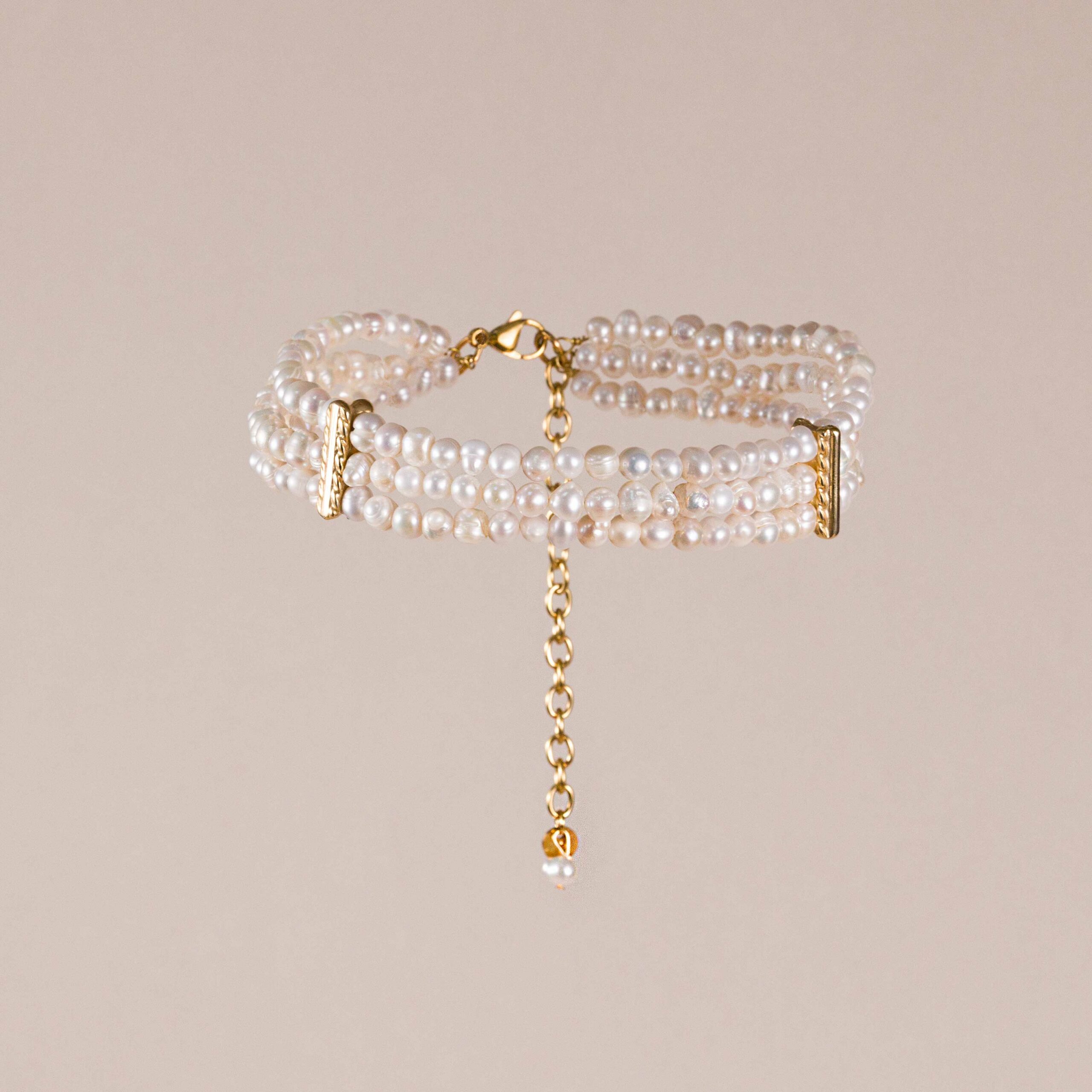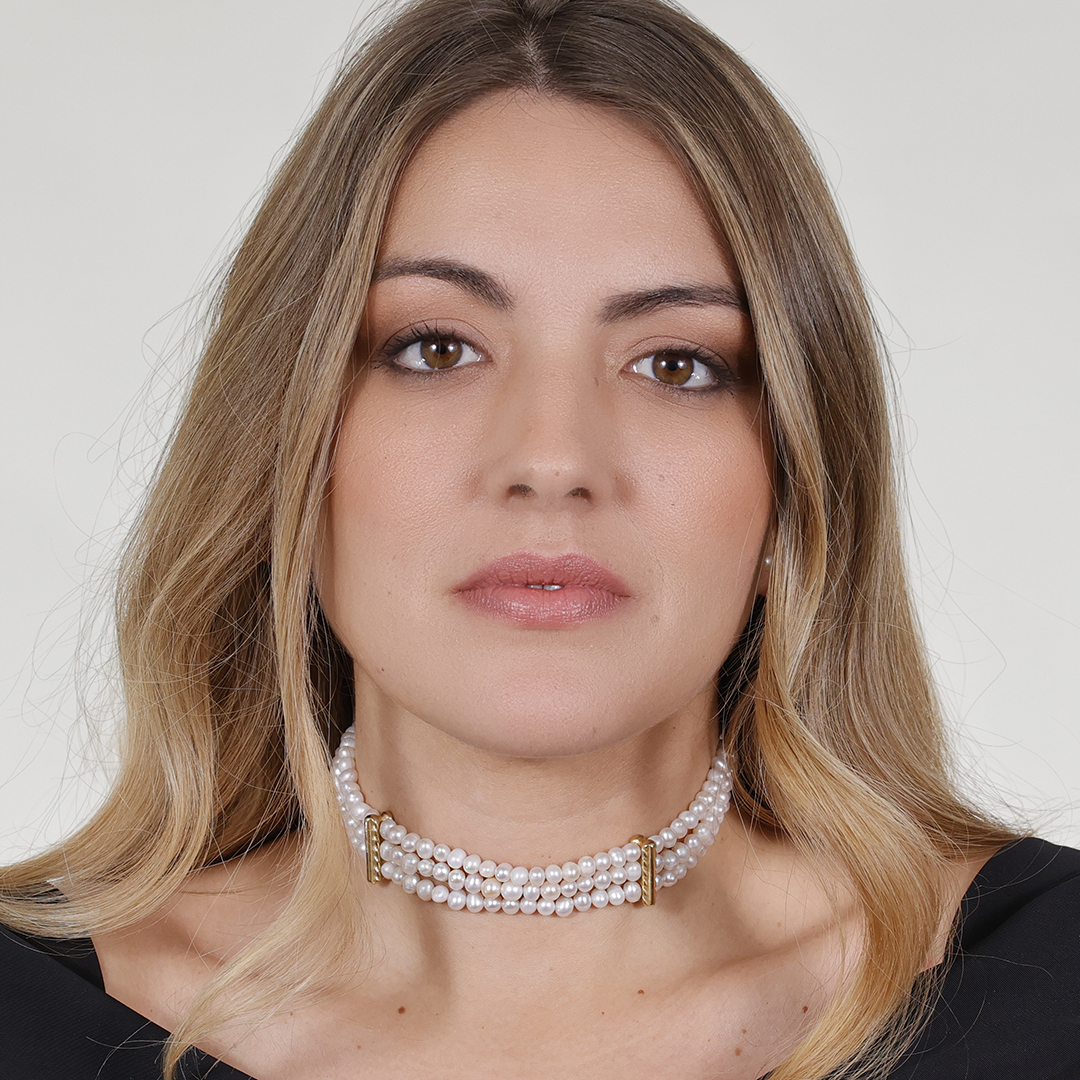 Nuestro equipo creativo ha vuelto a hacer de las suyas, reinventando el clásico collar de perlas y presentándolo como un choker de tres vueltas con perlas de agua cultivadas en un blanco deslumbrante y de tamaño medio. Cada perla es una obra maestra única en sí misma, con detalles que te dejarán boquiabierto. Y ¿qué tal esos barras doradas labradas al estilo antiguo en cada fila de piedras? Simplemente sublime.