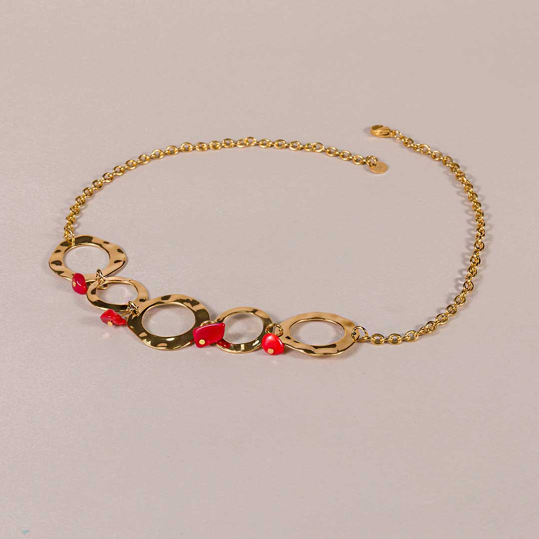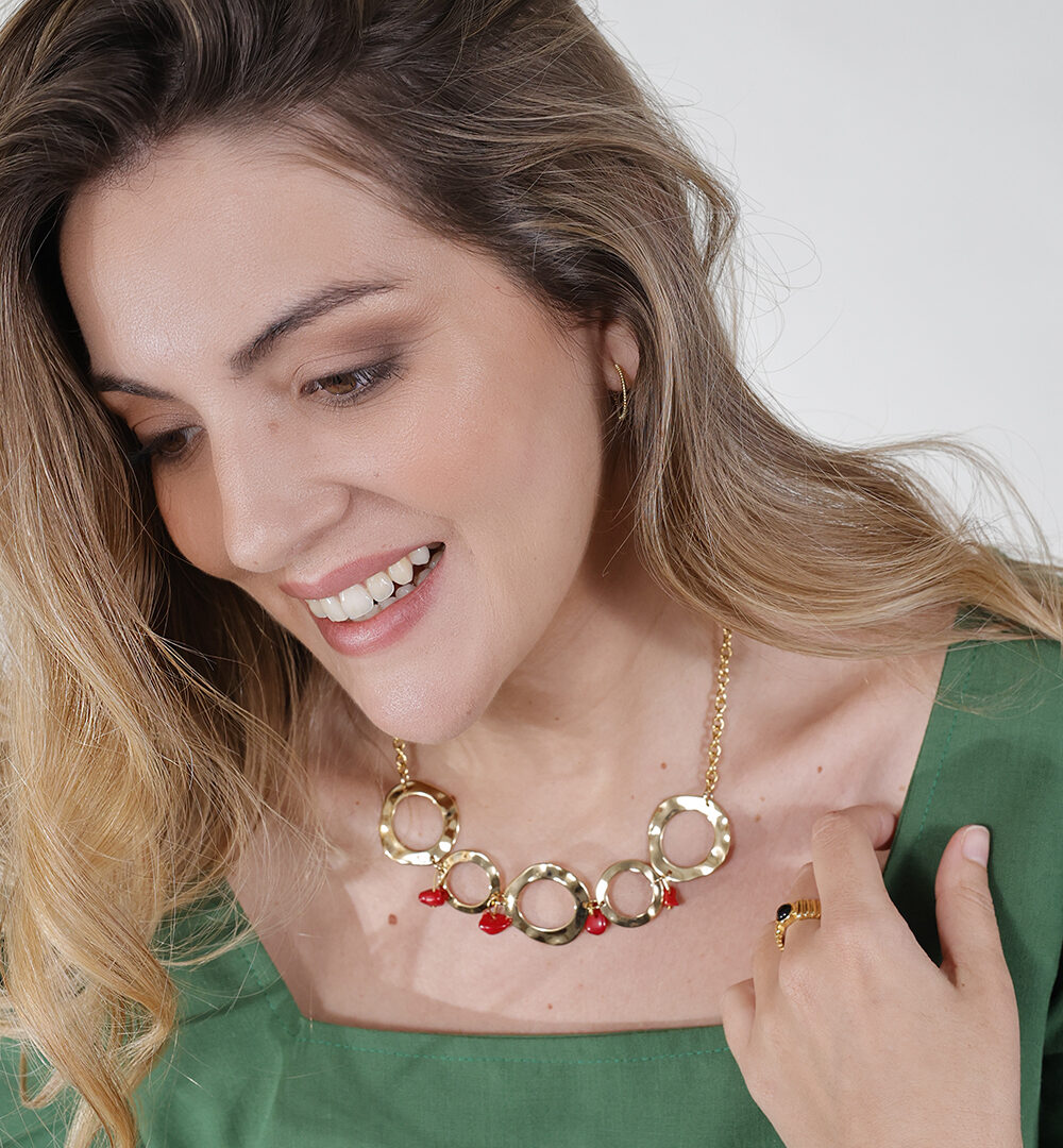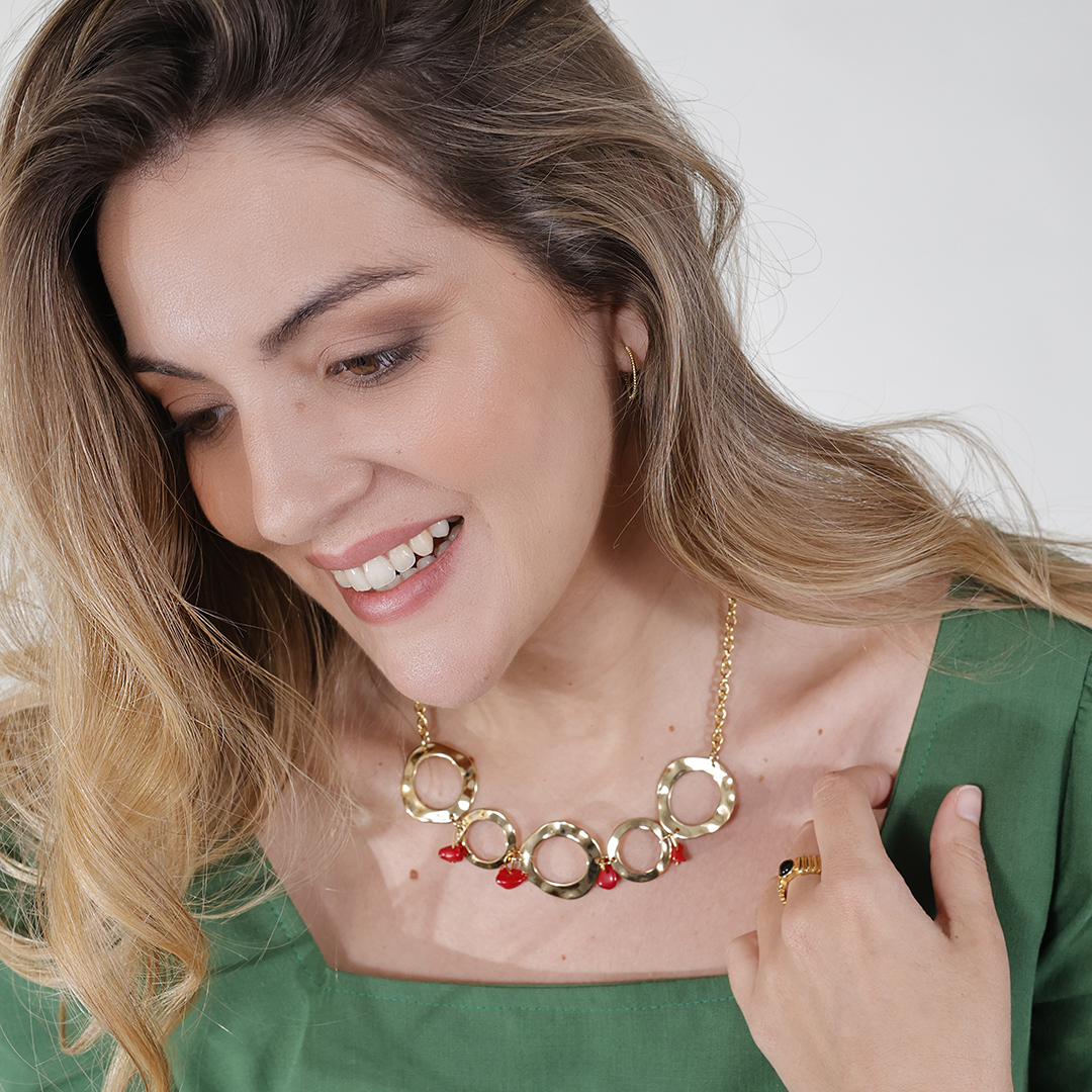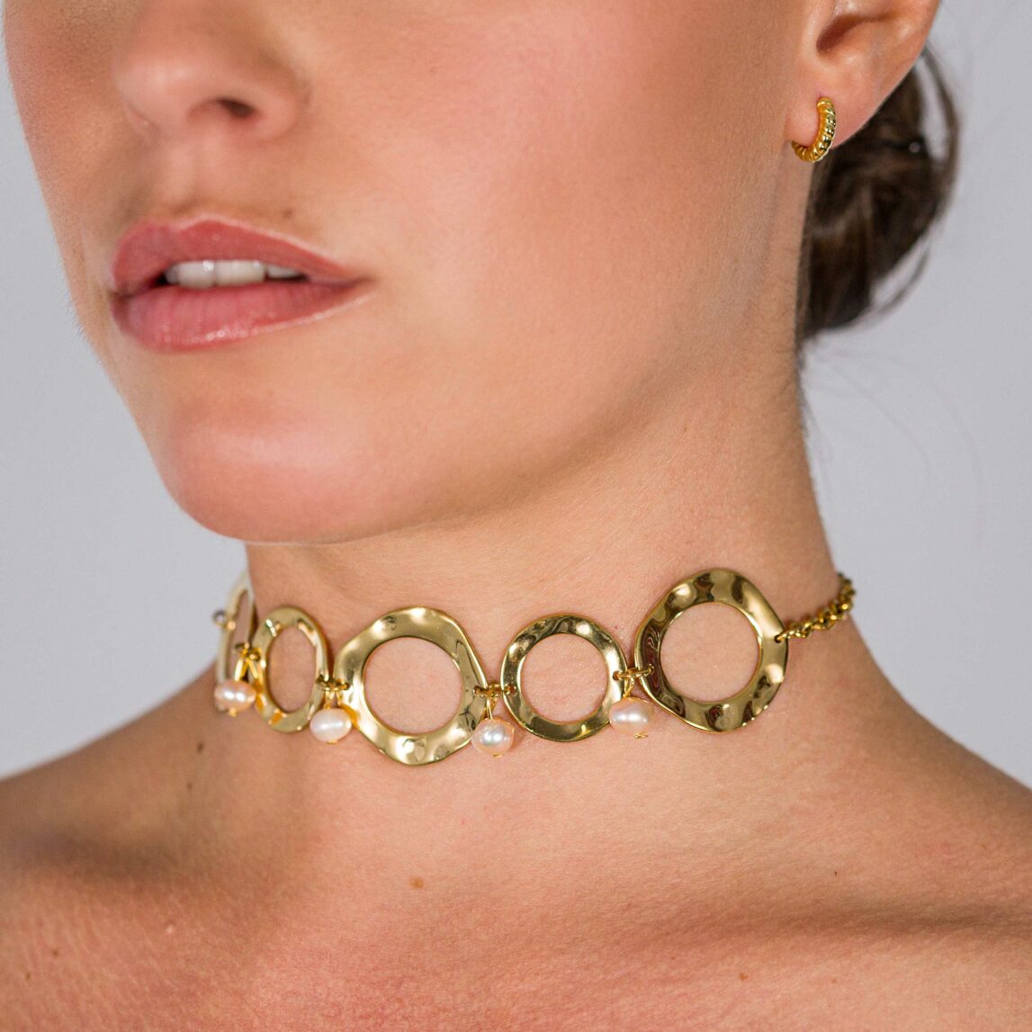 El Choker Misuri está disponible en dos acabados elegantes y naturales que se adaptan a diferentes gustos y ocasiones. La primera opción incluye delicadas perlas de río, conocidas por su belleza clásica y su brillo sutil, perfectas para un look refinado y atemporal. La segunda opción presenta piedra natural de coral, que aporta un toque vibrante y único, ideal para quienes prefieren un estilo más atrevido y con carácter.