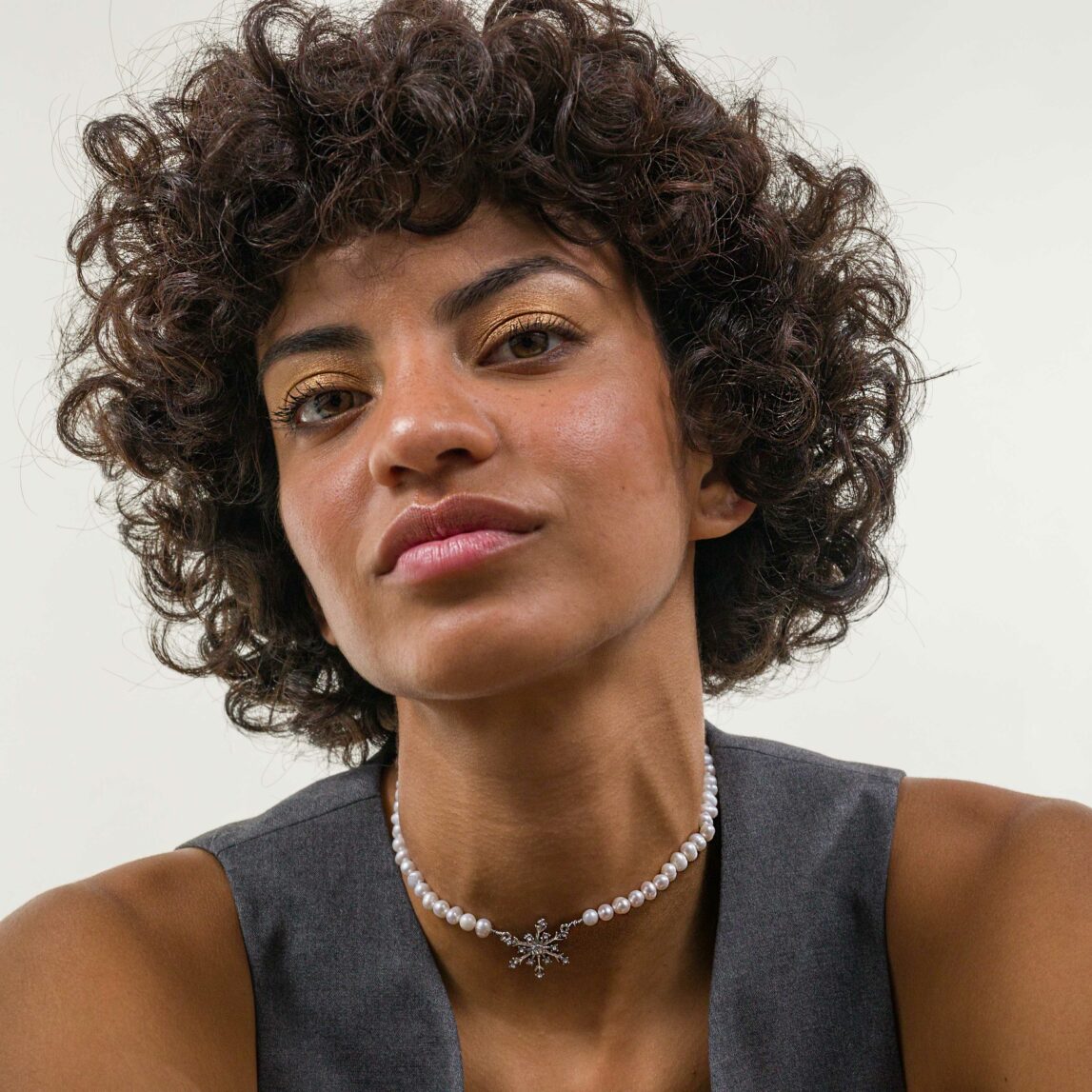 El diseño del Choker Nicola presenta una estrella de acero inoxidable decorada con circonitas blancas, y una línea de perlas de agua cultivadas en un precioso tono blanco. Cada una de estas perlas tiene sus propias particularidades en forma y acabado, lo que las hace aún más espectaculares.