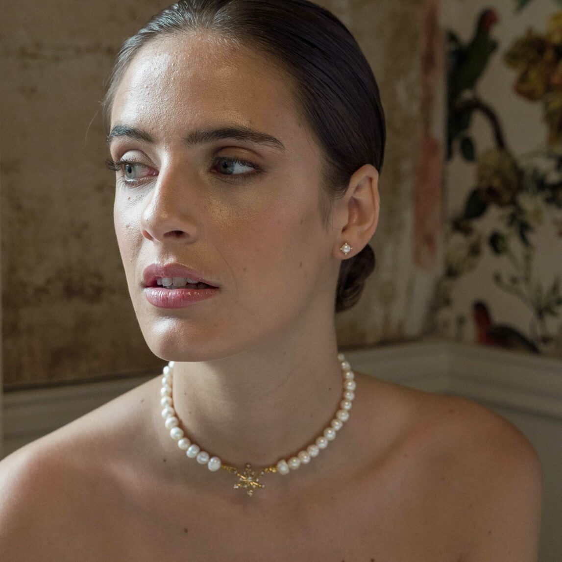 Este choker combina la pureza de las perlas de agua con el brillo de las circonitas en su estrella central. Es una pieza realmente especial, diseñada por nosotras pensando en días igualmente especiales, como tu boda. Pero también es perfecta para lucirla como una invitada única y destacada en cualquier evento.