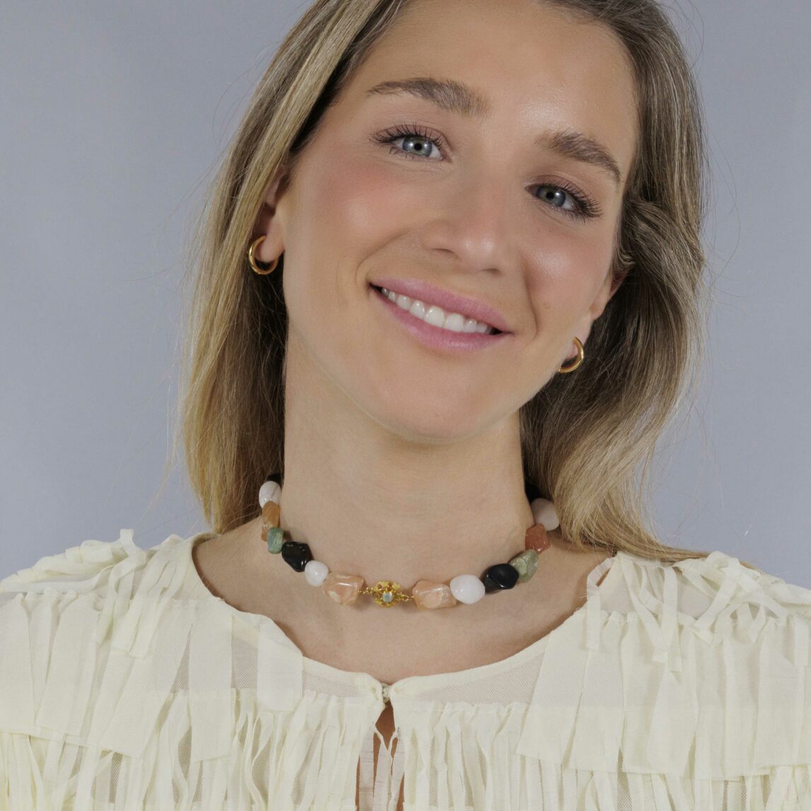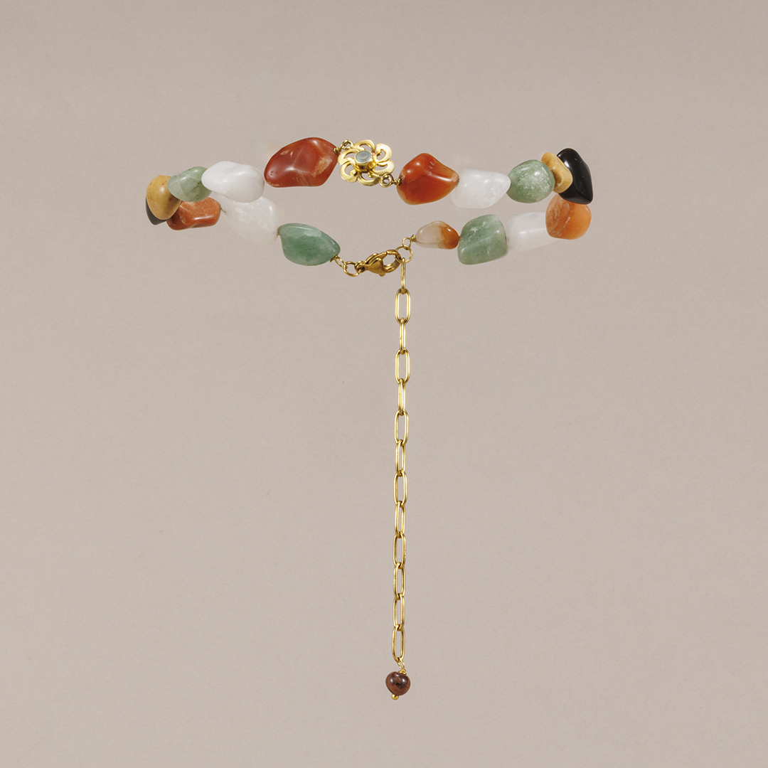 El protagonista del diseño es un broche calado en Plata 925 con baño de oro de 18 quilates que lleva en el centro una circonita con un toque de color, según la piedra disponible. Desde ese punto mágico nace una cadena de piedras naturales irregulares en tonos tierra y verde agua —sí, has leído bien, aventurina incluida, nuestra favorita para canalizar buenas energías y elegancia.