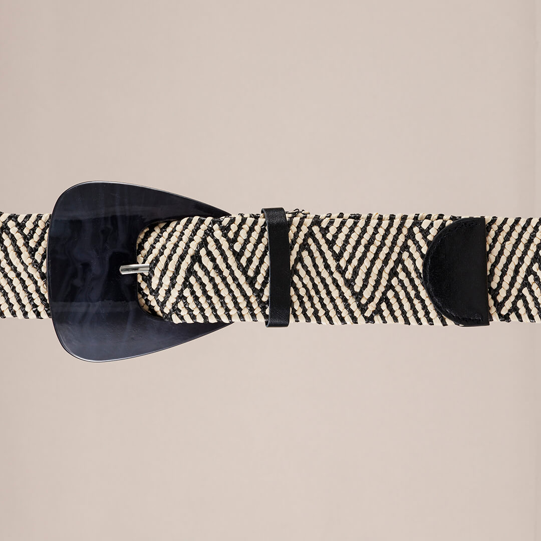 El Cinturón de rafia Tatiana en blanco y negro es elástico, de talla única y con una hebilla negra en imitación hueso. Versátil, cómodo y con mucho estilo.