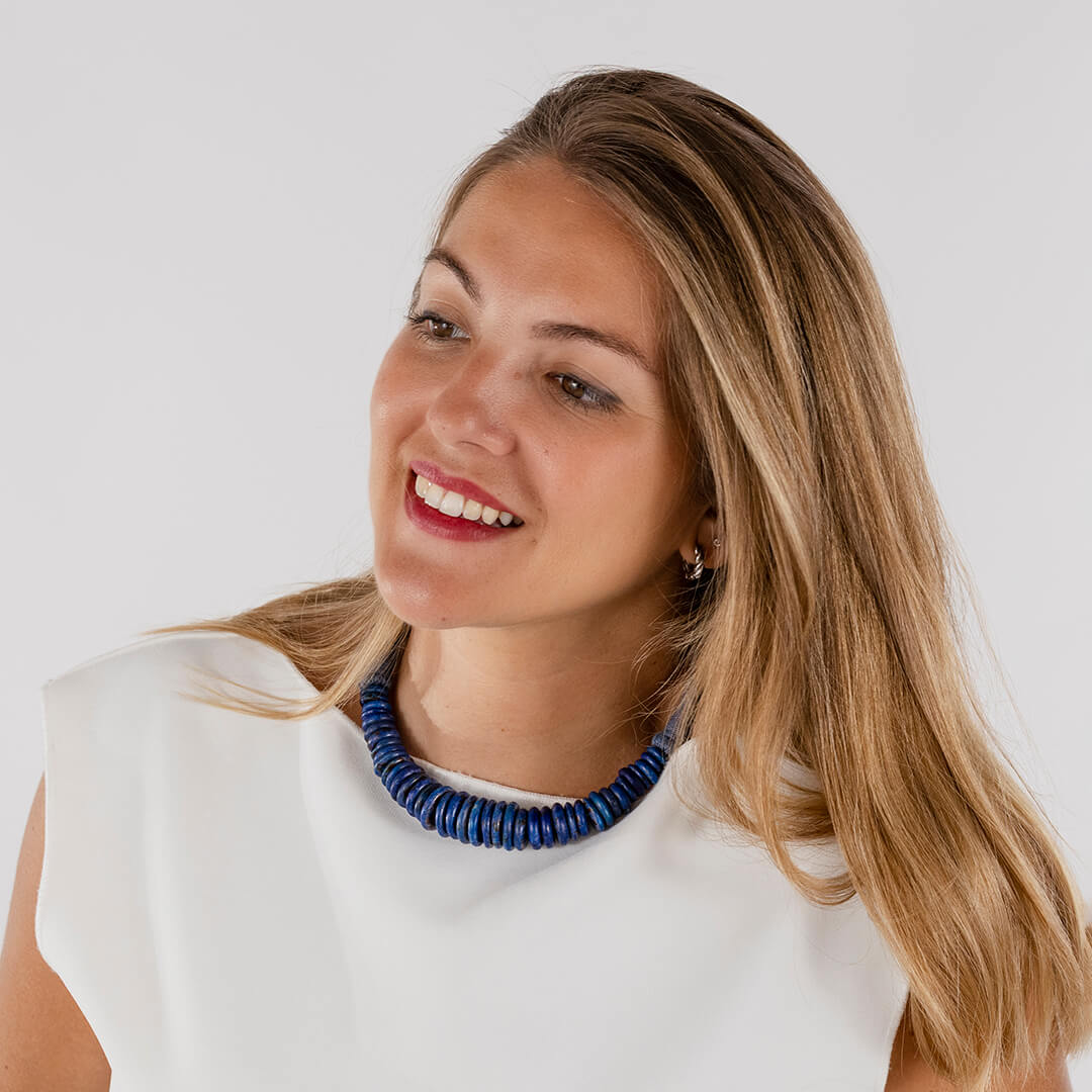 El Collar África es un collar africano artesanal hecho en madera azul Klein. Único, étnico y lleno de personalidad, ideal para realzar cualquier look.