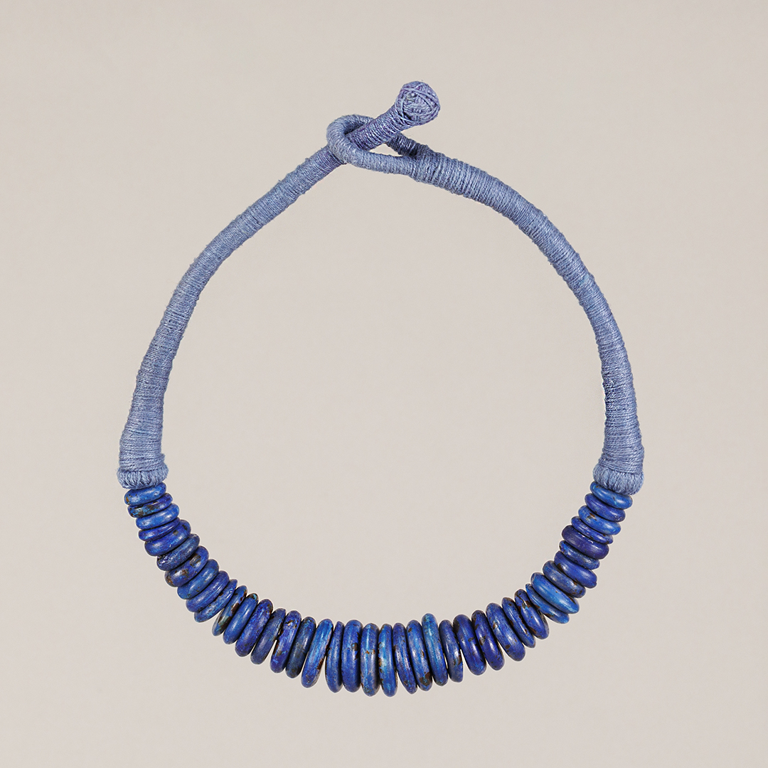 Los collares étnicos africanos siempre han sido símbolo de identidad y tradición, y este diseño está inspirado directamente en esa esencia. Está elaborado a mano con madera pintada en un vibrante azul Klein, un tono intenso que destaca sobre cualquier look. Sus cuentas redondas se disponen en el centro, mientras que el resto del collar está tejido con fuerza para darle rigidez y lograr un acabado tipo choker africano que se ajusta perfectamente al cuello.