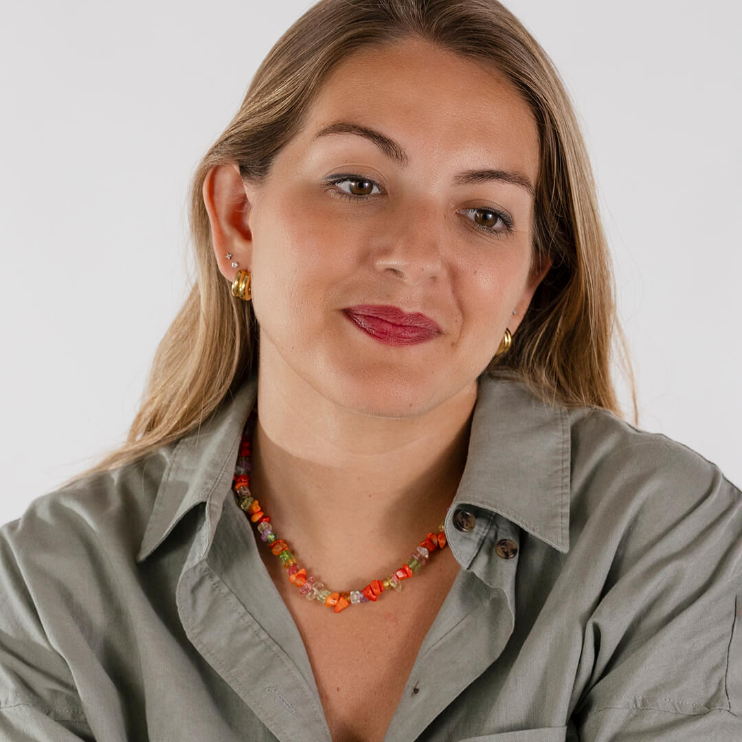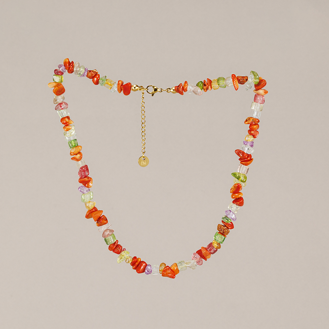 Montado a mano en nuestro taller, el Collar Candy combina coral naranja con piedras transparentes en tonos verde, amarillo, rosa y azul. Cada piedra tiene una forma irregular, lo que convierte a cada collar en un diseño único. Al ser piedras naturales, los tonos pueden variar respecto a las fotos, aportando autenticidad y personalidad.