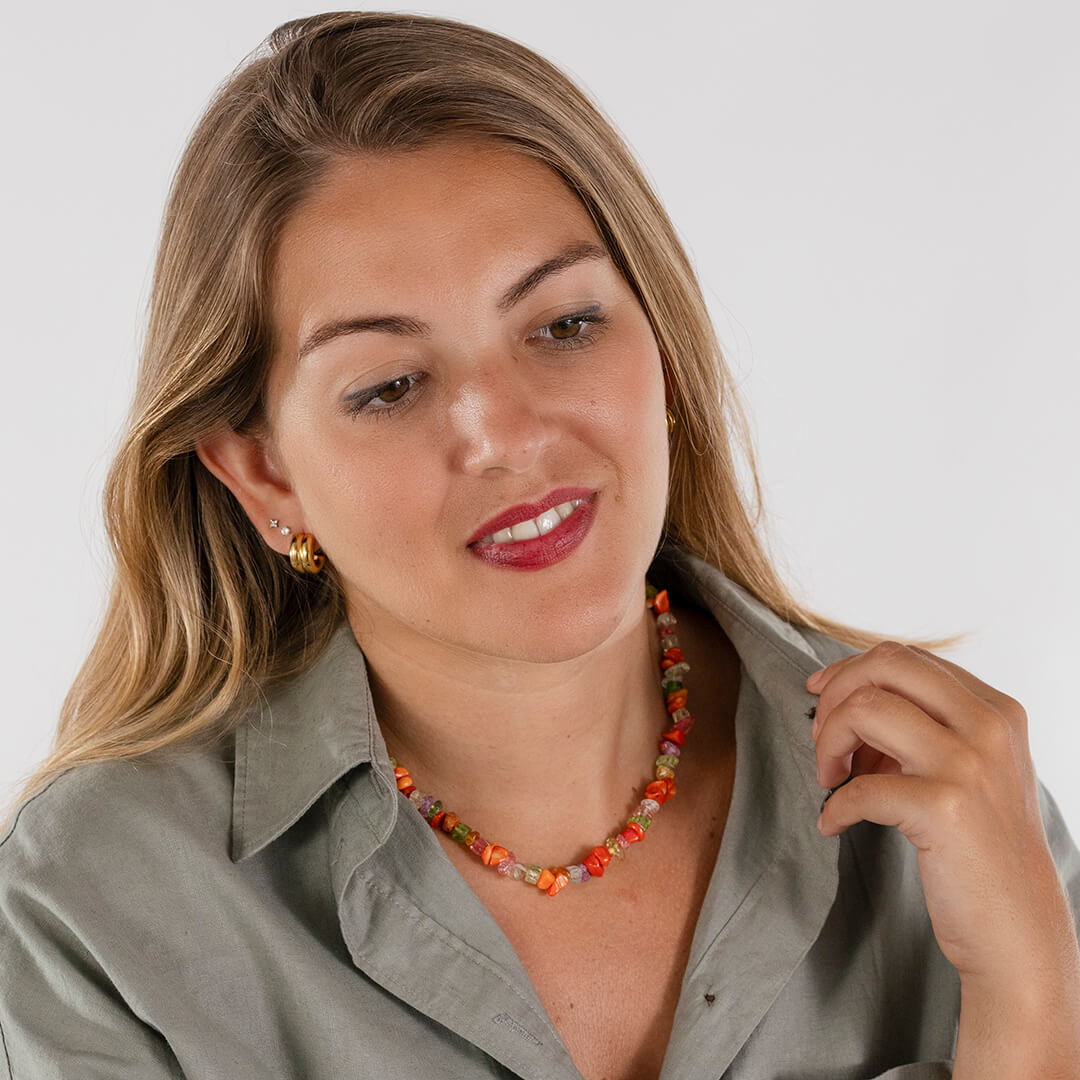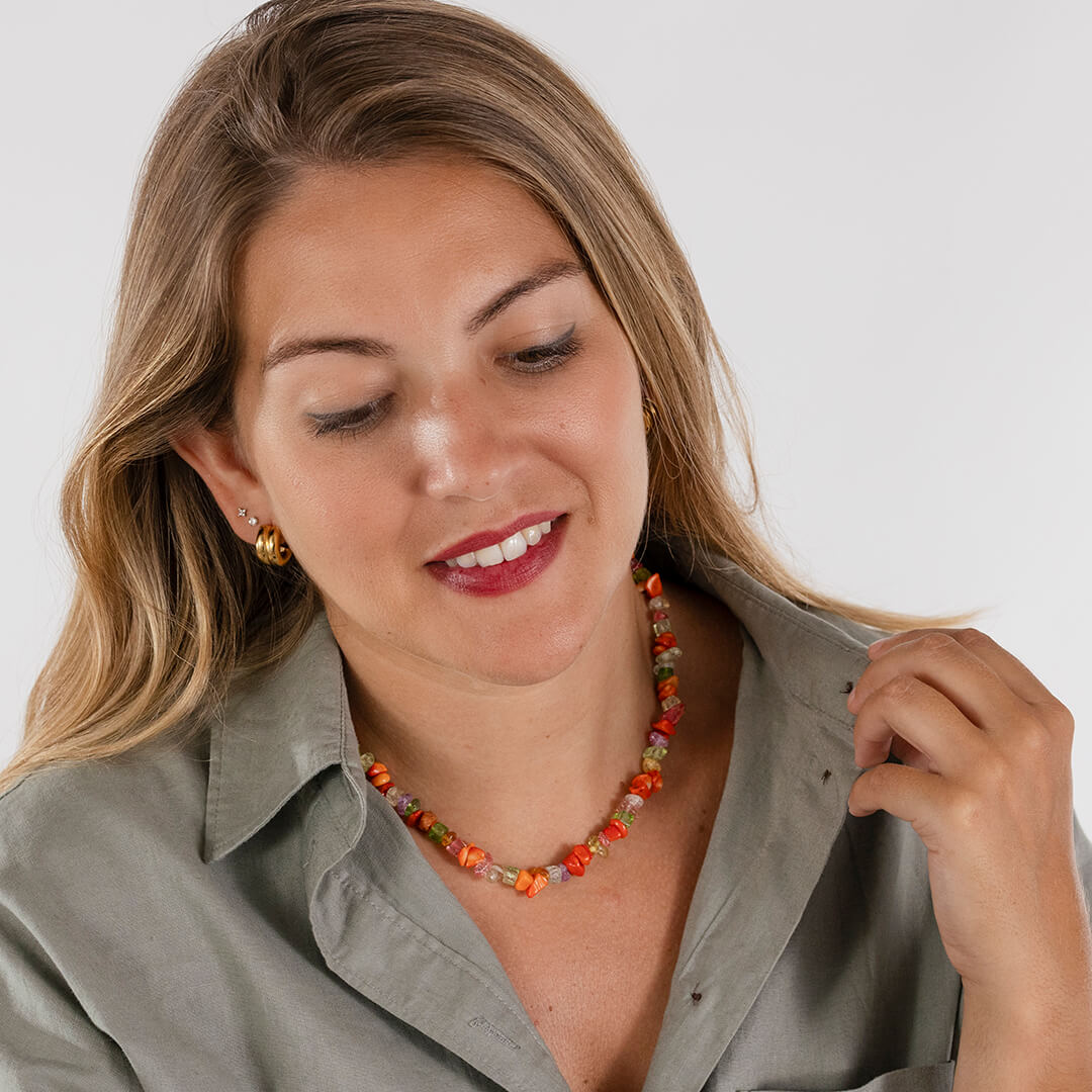 El Collar Candy combina coral naranja y piedras de colores vibrantes en acero inoxidable dorado. Artesanal, alegre y resistente al agua.