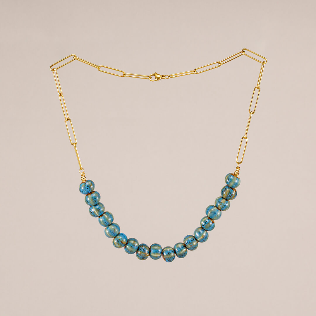 Cada cuenta del Collar Elizabeth está hecha a mano en cerámica esmaltada, un material que aporta brillo, textura y un toque único a cada pieza. Las cuentas se ensamblan cuidadosamente en una cadena de acero inoxidable dorado, resistente al uso diario y perfecta para quienes buscan una joya que acompañe su estilo sin perder durabilidad ni elegancia.