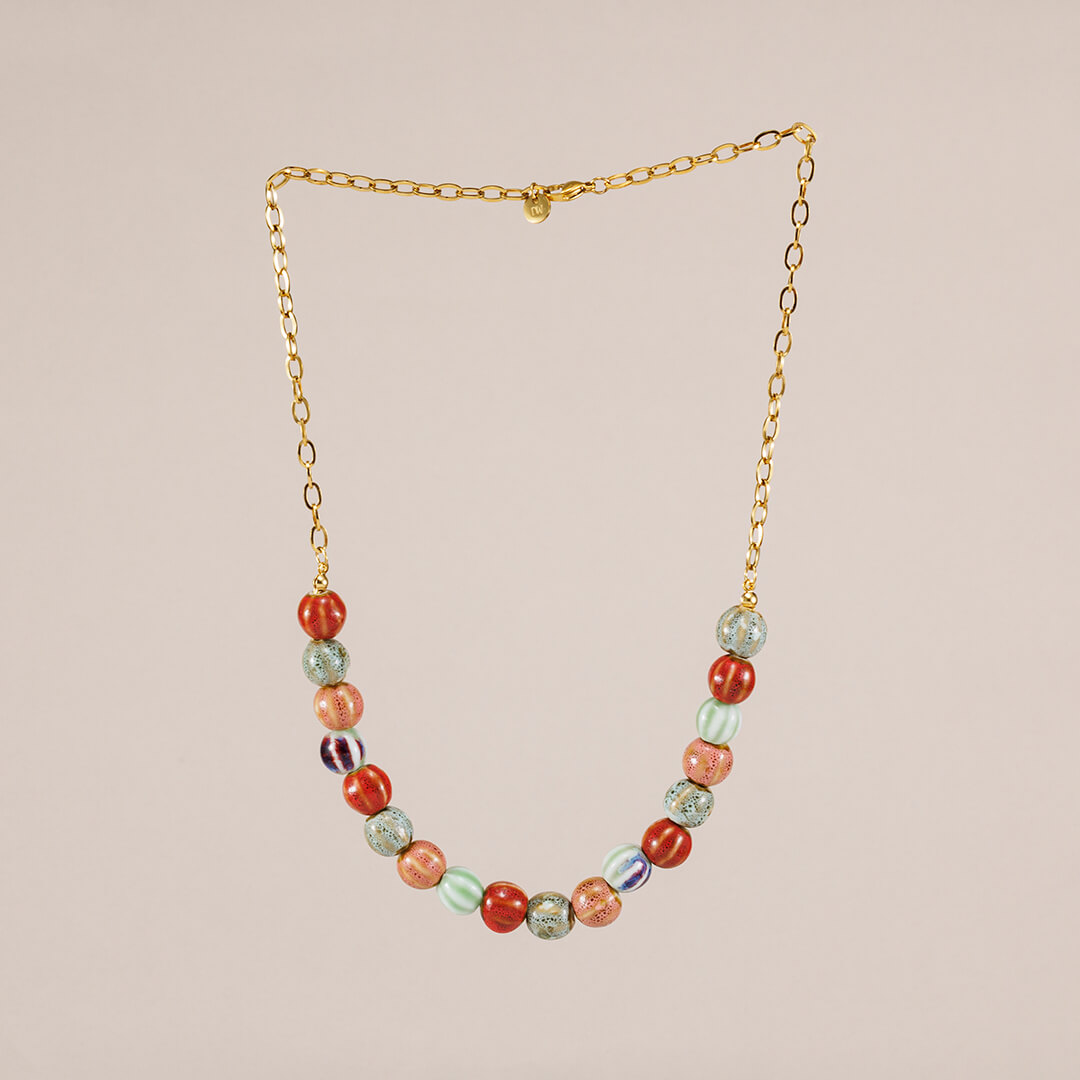 El Collar Elizabeth es una joya artesanal inspirada en el Collar Giulia, pero con un diseño más delicado y ligero gracias a sus piezas pequeñas de cerámica esmaltada. Cada cuenta está hecha a mano y lleva en una cadena de acero inoxidable dorado, resistente, hipoalergénica y pensada para acompañarte tanto en el día a día como en ocasiones especiales.