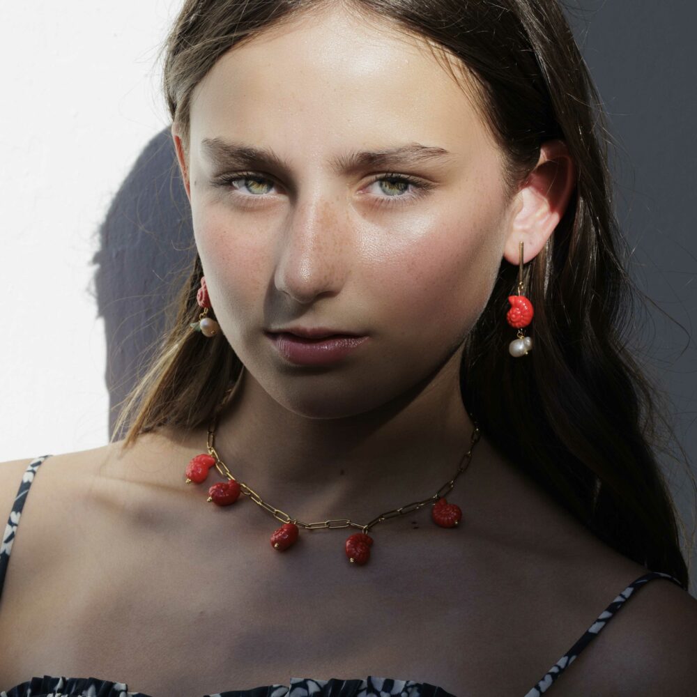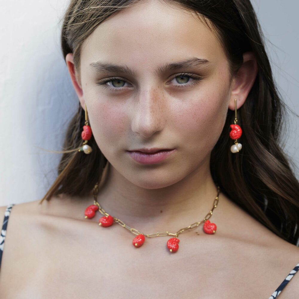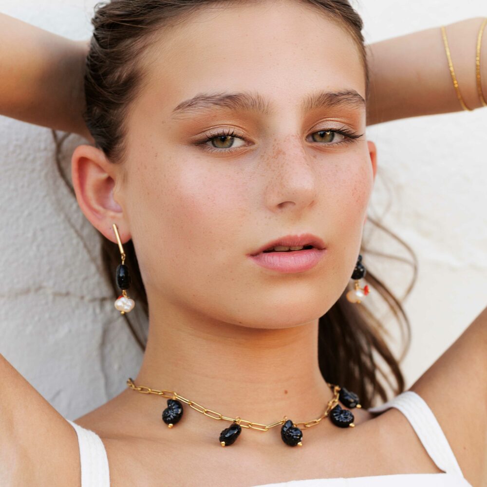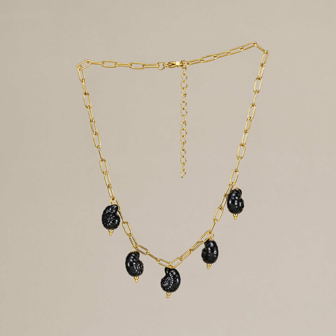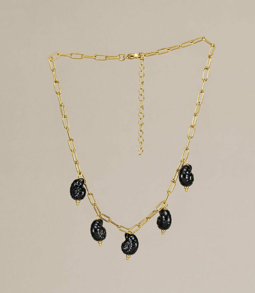 El diseño está hecho con caracolas de cerámica esmaltada pintadas a mano (sí, cada una es única). Todo está montado sobre una cadena de eslabones medianos dorados, muy similar a nuestra clásica cadena básica Lina, fabricada en acero inoxidable dorado. ¿Qué significa esto? Que es waterproof e hipoalergénica. La puedes mojar sin miedo (¡agua dulce, eso sí!) y es perfecta incluso para pieles sensibles.