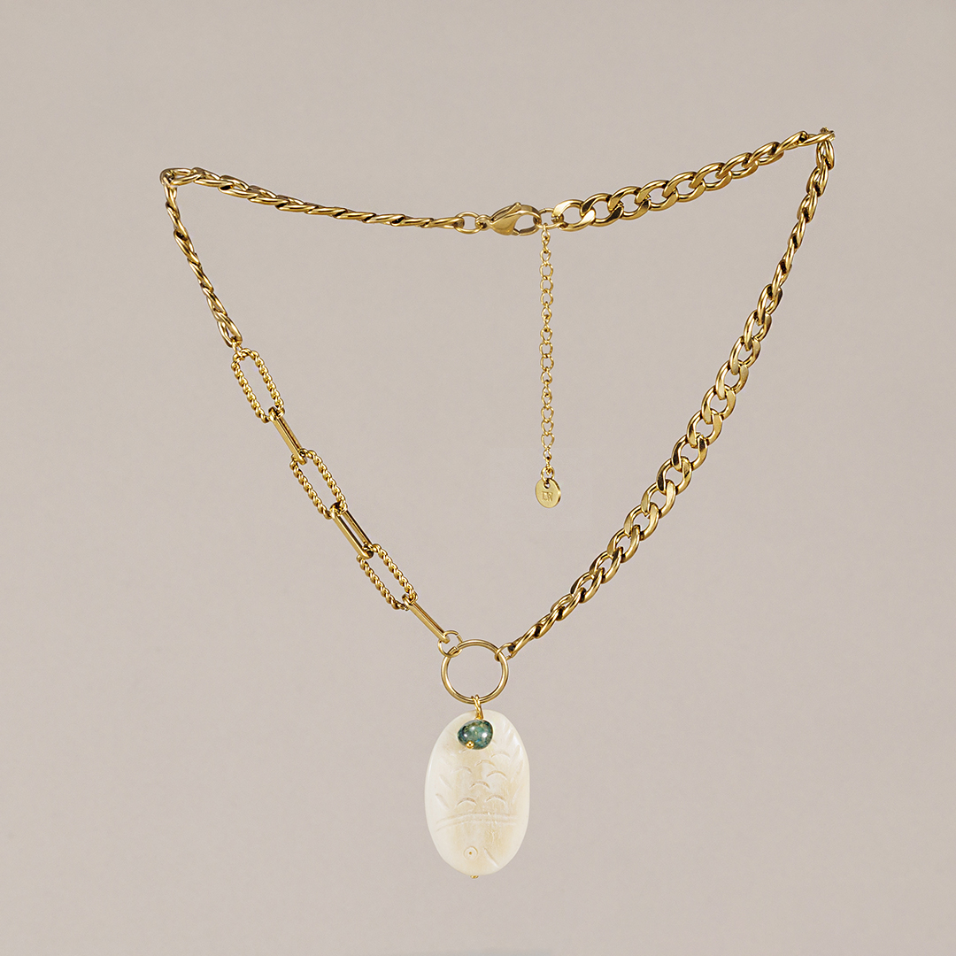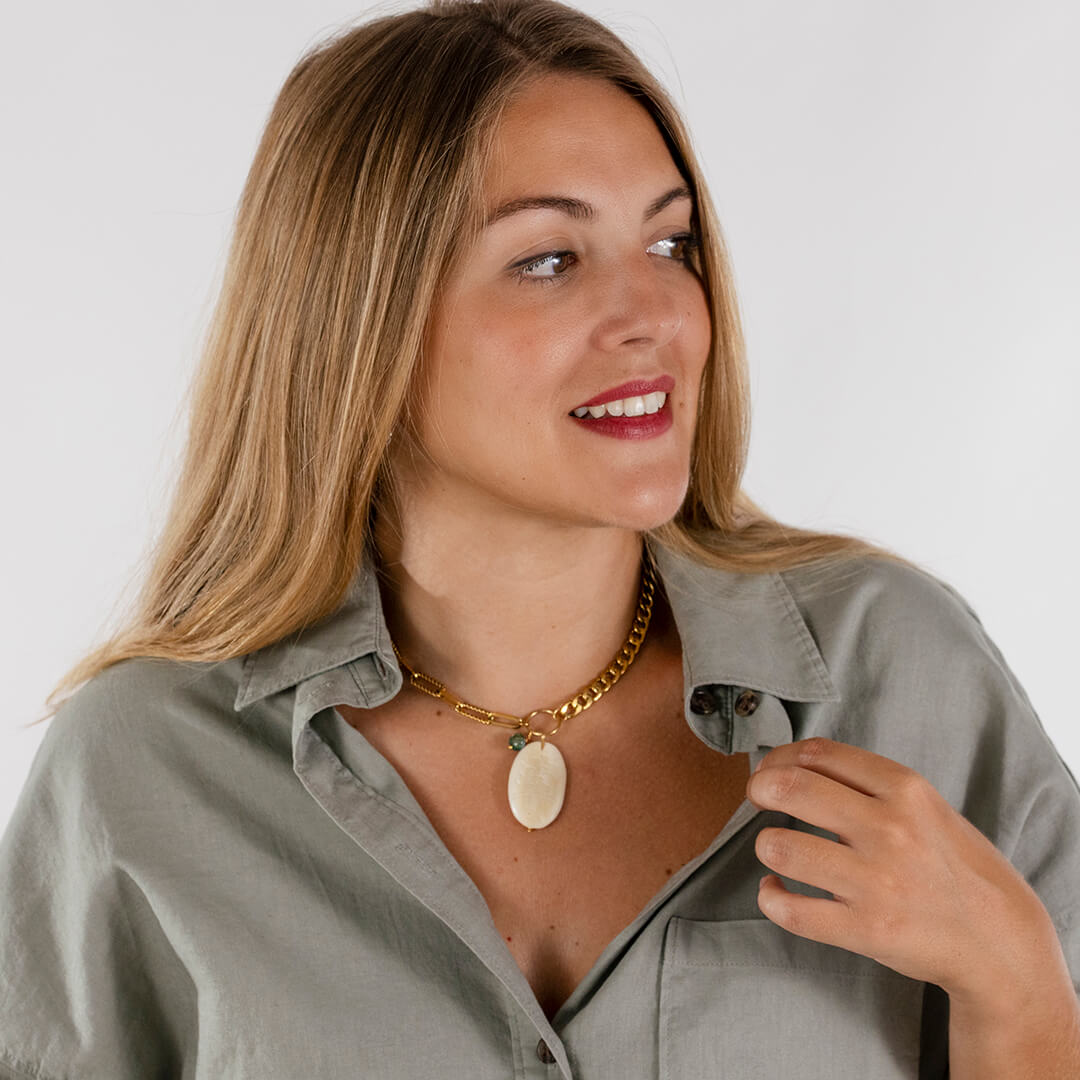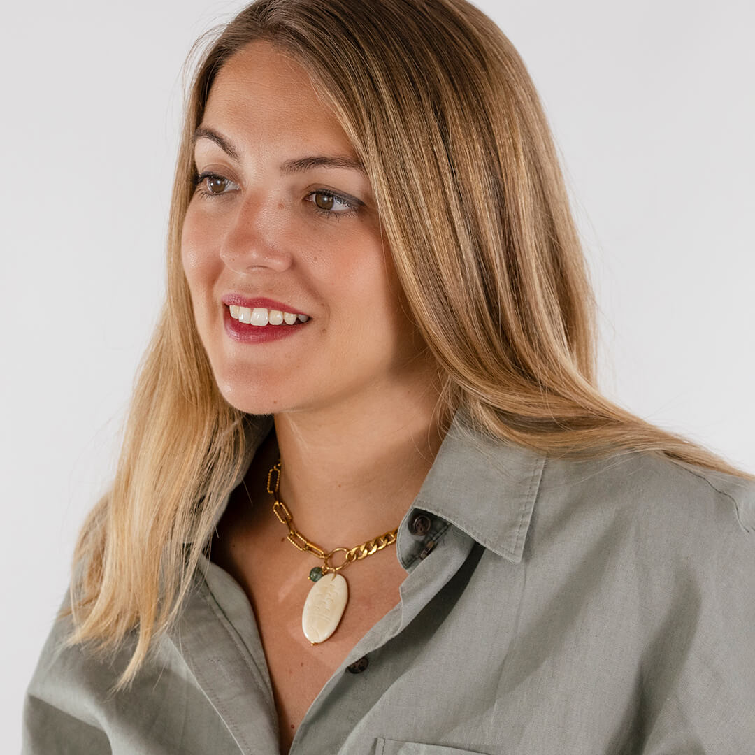 Este collar artesanal está montado sobre una cadena dorada de acero inoxidable, un material resistente, waterproof e hipoalergénico, ideal para pieles sensibles. Lo mejor es que no pierde color con el uso, así que siempre brillará como el primer día. La cadena combina dos estilos de eslabones: un tramo tipo barbada y otro con eslabones más grandes y con relieve, lo que le da un aire moderno y muy versátil.