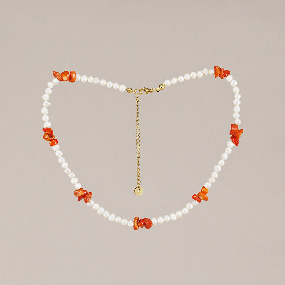 Más allá de su diseño, este collar también tiene un significado especial: las perlas se asocian a la pureza, la calma y la feminidad, mientras que el coral naranja es conocido por atraer vitalidad, energía positiva y protección. Juntos crean una joya con alma que no solo realza tu estilo, sino que también transmite buenas vibraciones.