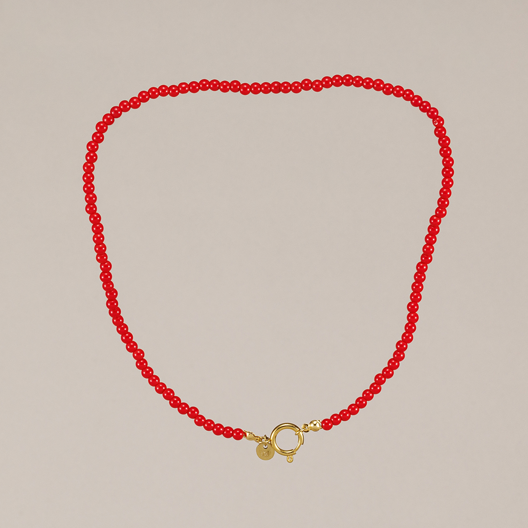 Si te enamoraste del Collar Carmela, prepárate porque llega su hermano pequeño: el Collar La Caleta. Una pieza hecha para convertirse en tu nuevo básico favorito. Este collar está montado con coralitos rojos redondos, alegres, vibrantes y llenos de energía. La gran diferencia está en su cierre: un broche marinero dorado, pequeño y práctico, que no solo asegura el collar sino que también te permite colgar cualquier medalla de tu joyero o uno de nuestros charms dorados de Darwin Collection. ¡Imagina todas las combinaciones posibles!