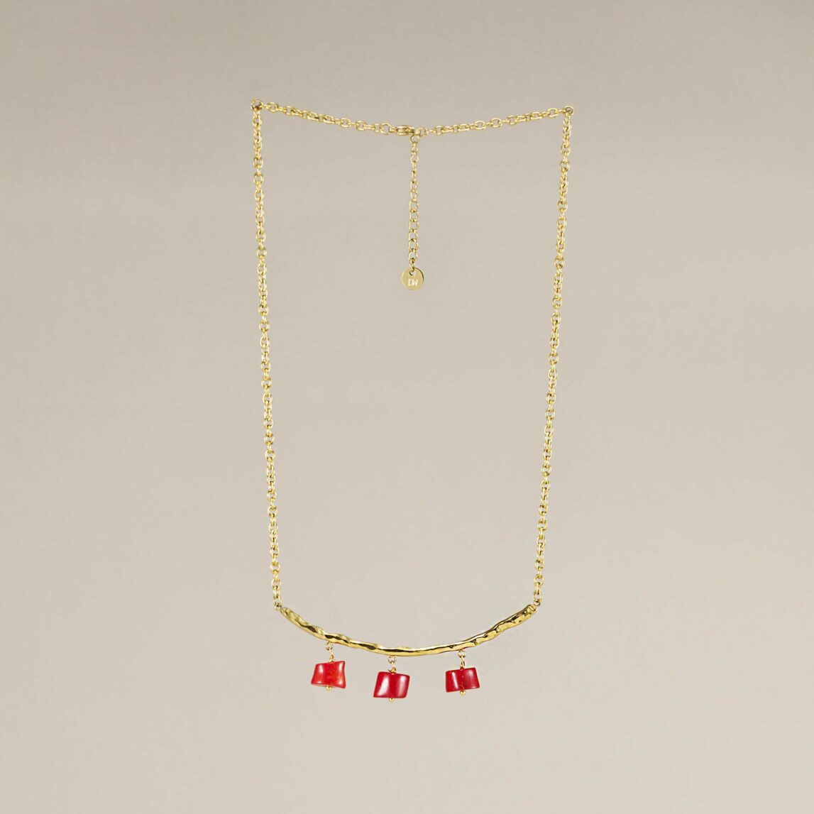 Hecho en acero inoxidable dorado, este collar es resistente al agua (waterproof) e hipoalergénico, ideal para llevarlo todos los días sin preocuparte. Lleva una cadena tipo de eslabón , acompañada por una barra central dorada con raíces de coral rojo que aporta un toque sofisticado.