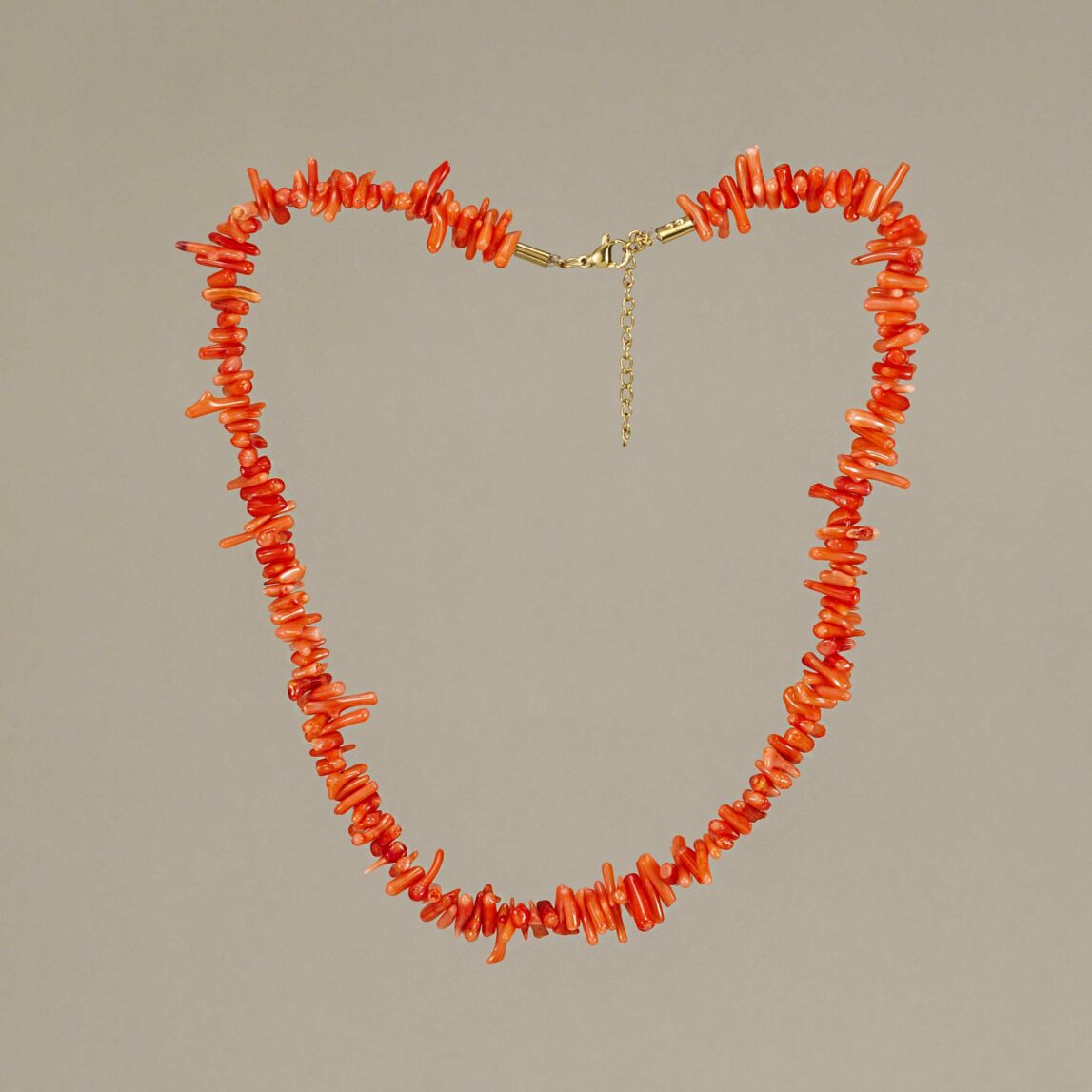 Collar de piedra natural con coral rojo o naranja, montado en acero inoxidable dorado. Waterproof, hipoalergénico y con cierre ajustable. Ideal para looks de verano y superposición de collares. ¡Un básico de la temporada!