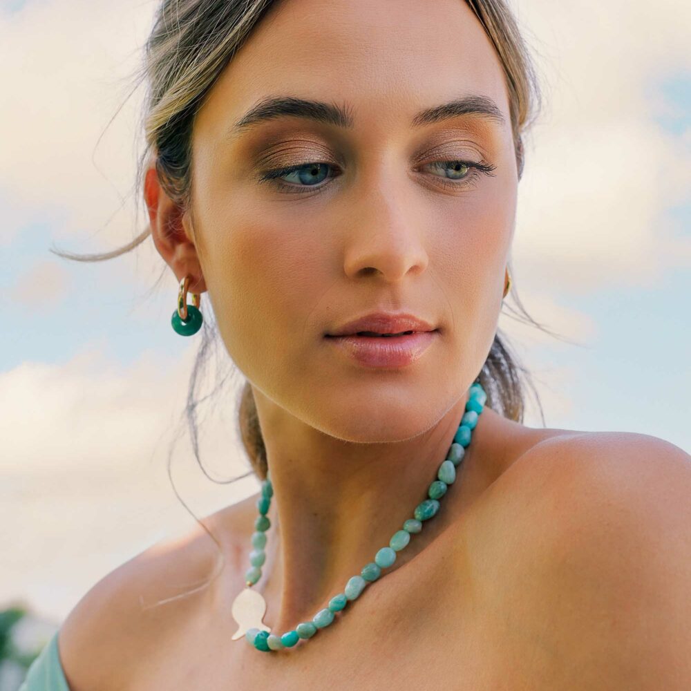 Este collar está montado entero con piedras naturales redondeadas de amazonita, que tienen un favorecedor color verde aturquesado, recordándonos tanto a las aguas del mar. Pero el toque más especial de este collar lo aporta una entrepieza en forma de pez dorado. Un detalle súper bonito que le da ese aire fresco y veraniego que tanto nos encanta.
